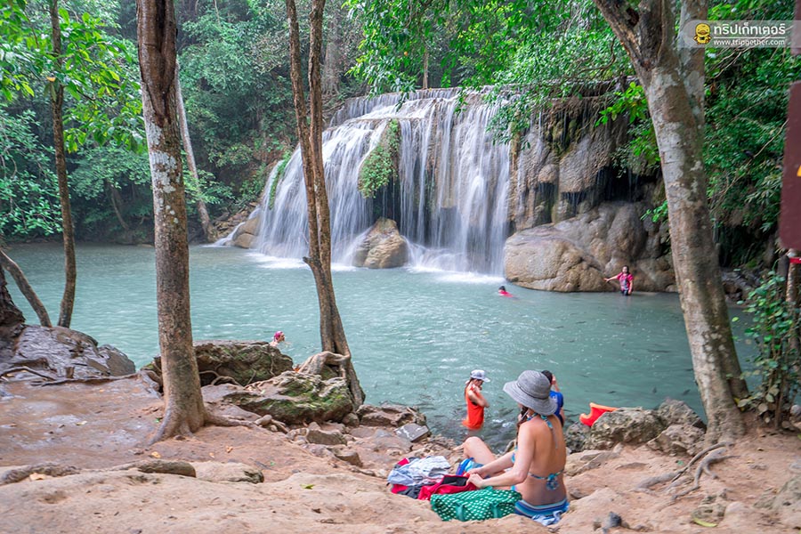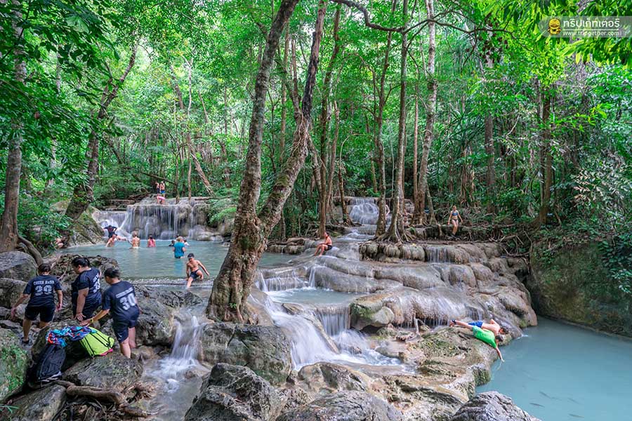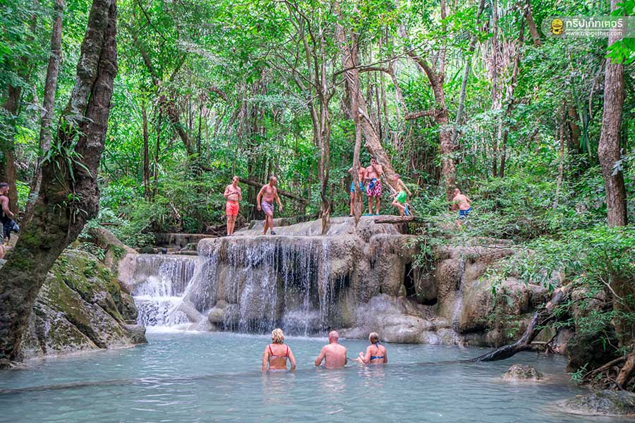 น้ำตกเอราวัณ น้ำตกสวยและมีชื่อเสียงของ จ.กาญจนบุรี เป็นน้ำตกที่สวยงามบนฝั่งแม่น้ำแควใหญ่ และมีลักษณะที่โดดเด่นคือเป็นน้ำตก 7 ชั้น คล้ายหัวช้างเอราวัณ 3 เศียร สำหรับน้ำตกทั้ง 7 ชั้นมีชื่อเรียกและความสวยงามที่แตกต่างกันออกไป คือ ชั้นที่ 1 ไหลคืนรัง / ชั้นที่ 2 วังมัจฉา / ชั้นที่ 3 ผาน้ำตก / ชั้นที่ 4 อกผีเสือ / ชั้นที่ 5 เบื่อไม่ลง / ชั้นที่ 6 ดงพฤกษา และชั้นสุดท้าย ชั้นที่ 7 ภูผาเอราวัณ ไฮไลท์ของที่นี่คือน้ำที่ใสจนมองเห็นเป็นสีฟ้าด้วยตาเปล่าและปลาที่แหวกว่ายให้เราได้ชมกัน และที่สำคัญเป็นน้ำตกที่สามารถลงเล่นน้ำได้อีกด้วย
