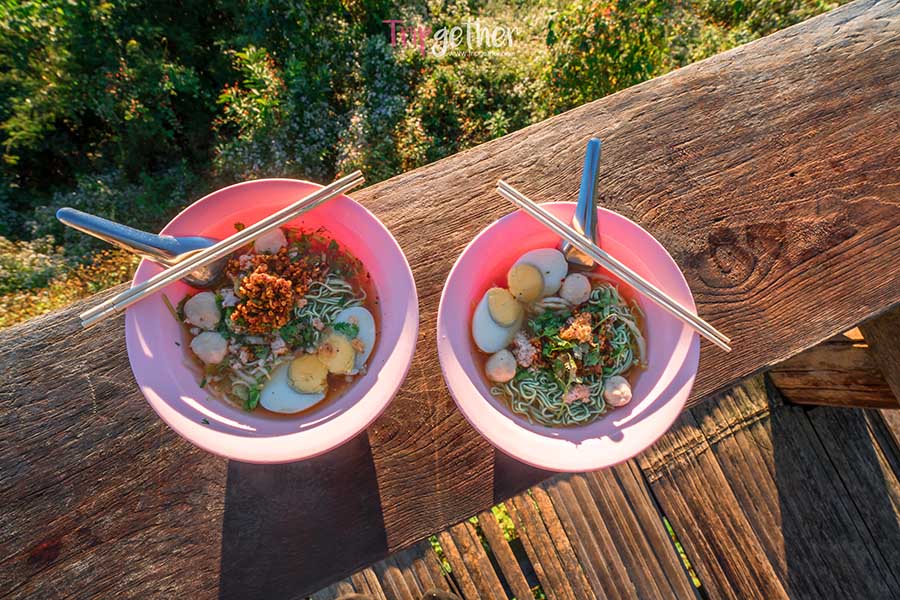 และมาบ้านจ่าโบ่ทั้งทีก็ต้องไม่พลาดกับ ก๋วยเตี๋ยวห้อยขาจ่าโบ่ ร้านนี้ตั้งอยู่บริเวณทางเข้าหมู่บ้าน ตัวร้านเป็นบ้านไม้ที่ตั้งอยู่ริมเนินเขา ภายในแบ่งออกเป็น 2 ชั้นมีมุมนั่งให้เลือกนั่งเพียบ ทั้งมุมโต๊ะ บาร์ห้อยขา และเปลตาข่าย ช่วงหน้าหนาวบรรยากาศฟินสุดๆ มีทะเลไอหมอกและแสงอาทิตย์ให้ความอบอุ่น ส่วนเมนูจะเป็นก๋วยเตี๋ยวหมู มีทั้งน้ำใสและต้มยำ และเส้นที่มีให้เลือกครบทั้งเส้นเล็ก เส้นหมี่ เส้นใหญ่ และเส้นพิเศษอย่าง มาม่าหยก ที่ทางร้านทำเอง แถมราคายังเป็นมิตร 40 บาทเท่านั้น นอกจากนี้ยังมีร้านกาแฟให้เลือกจิบอีกด้วยนะ