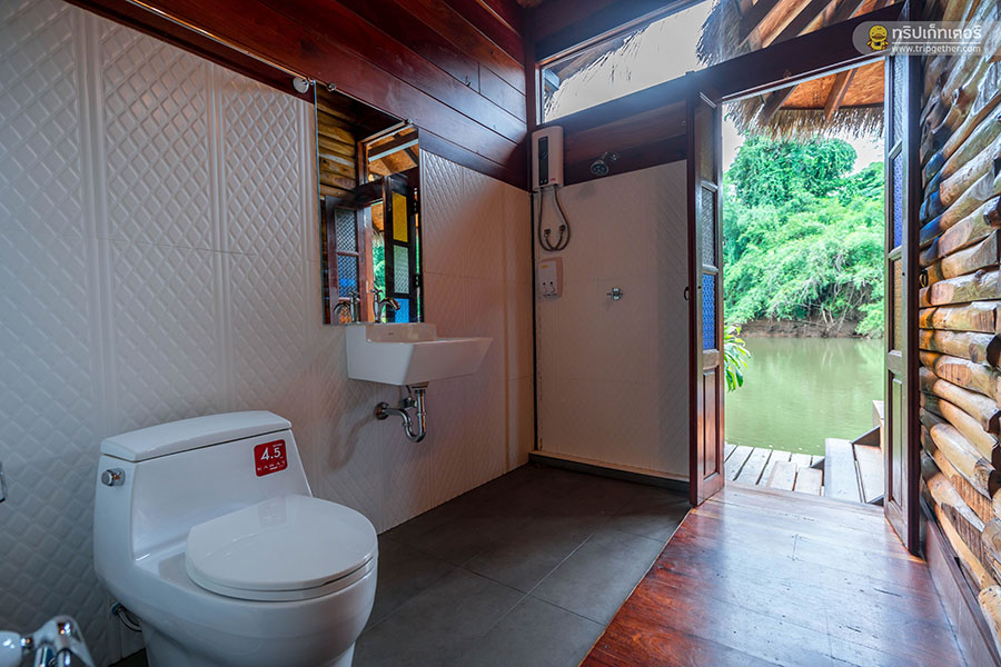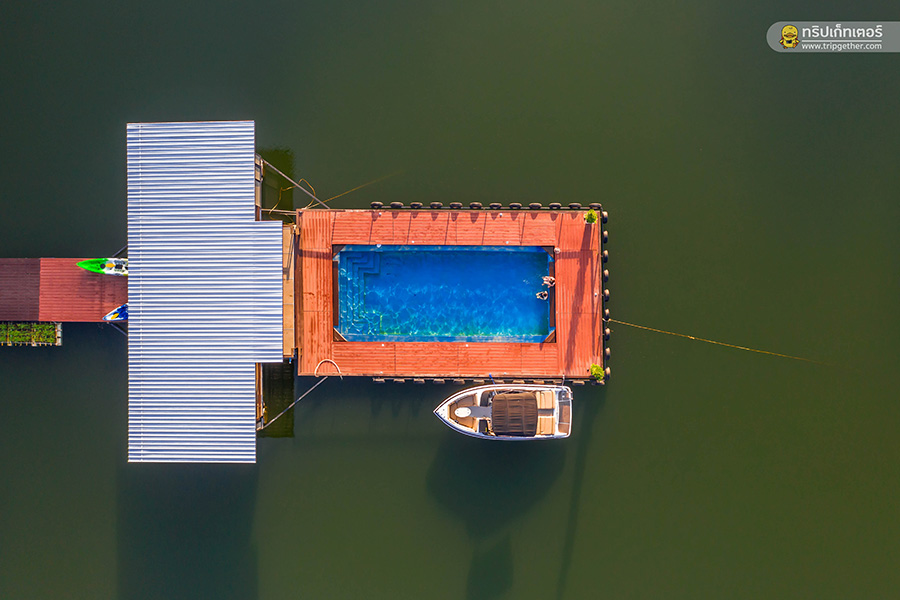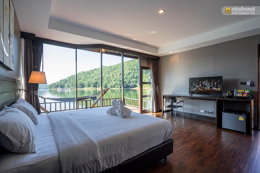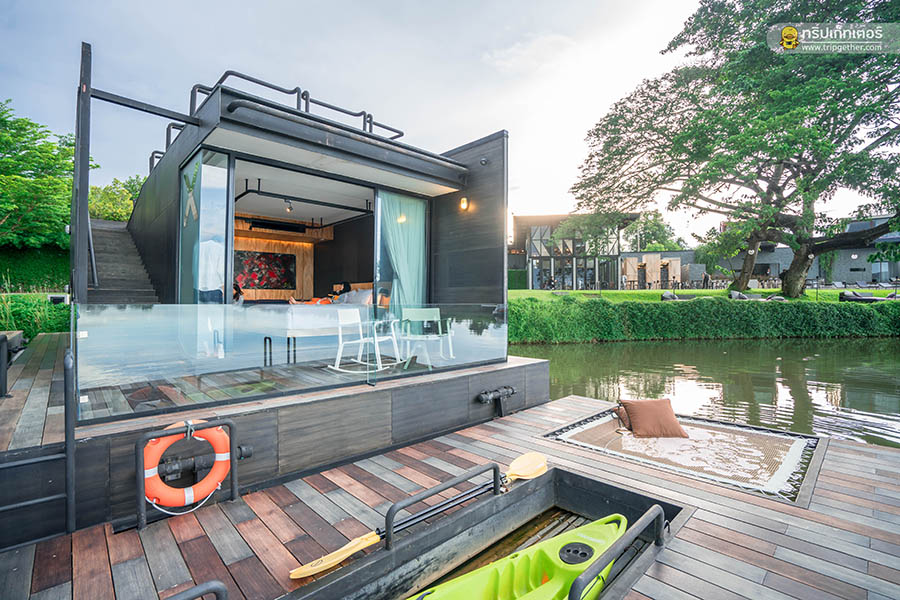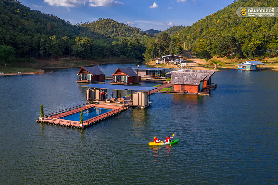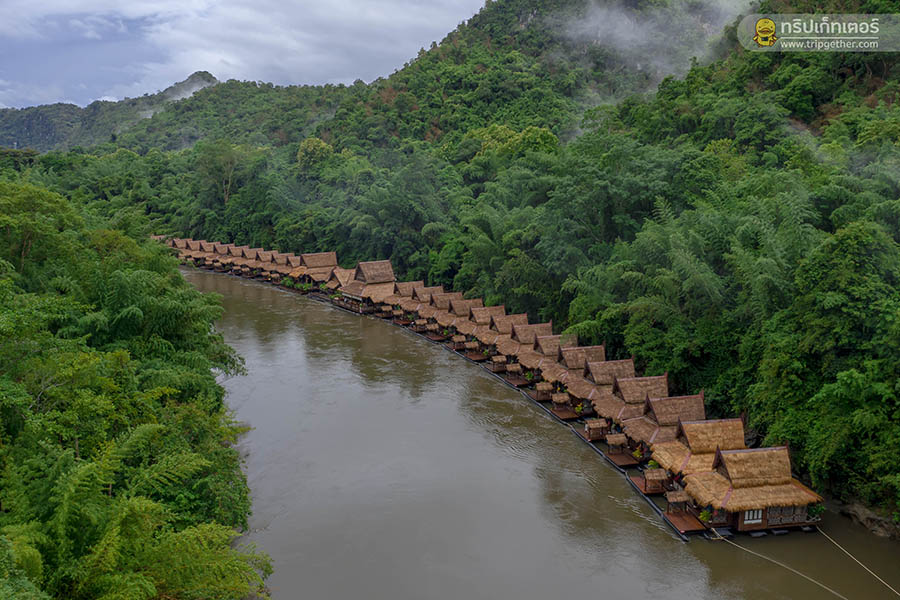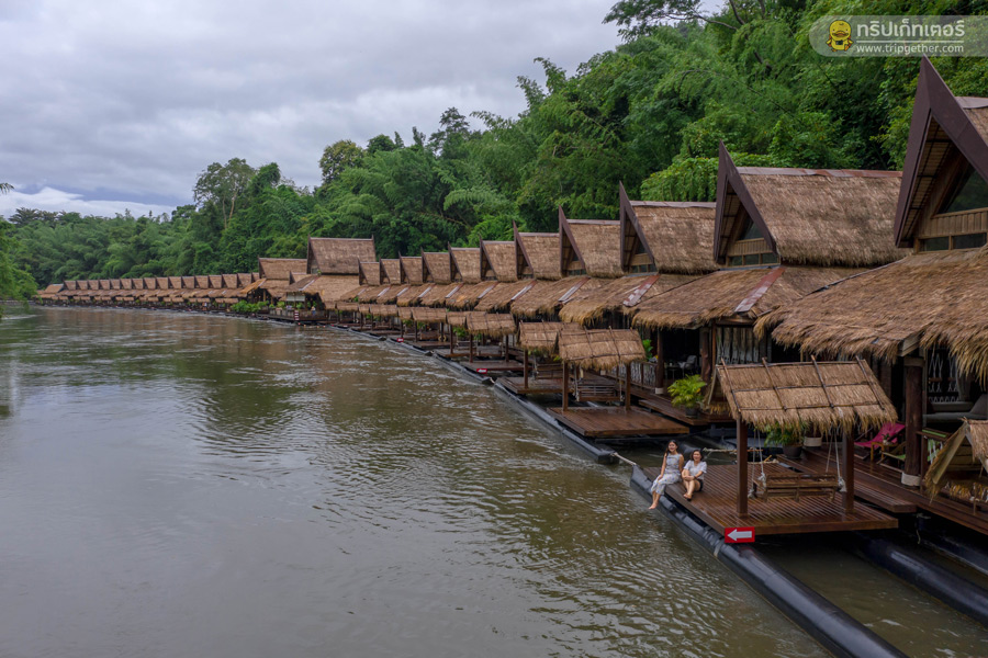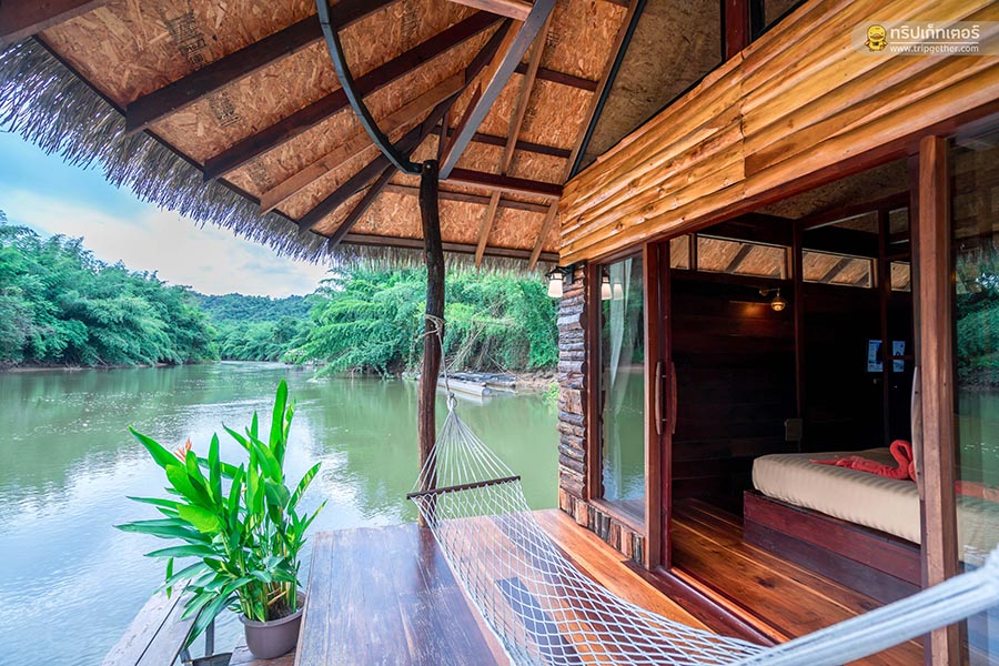 เดอะ โฟลทเฮ้าส์ ริเวอร์แคว รีสอร์ท ที่พักบนแพหรูที่ทอดยาวไปตามแม่น้ำแควที่เรียงรายกันกว่า 30 ห้อง ซ่อนตัวอยู่ในธรรมชาติกลางป่าเขาสุดชุ่มฉ่ำ การเดินทางก็ต้องนั่งเรือเข้ามายิ่งให้ความรู้สึกไฮด์อเวย์สุดๆ ส่วนภายในที่พักบรรยากาศดี สงบและเป็นส่วนตัว การออกแบบทั้งภายนอกและภายในเป็นสไตล์ไทยบูติกวิลล่า แฝงไปด้วยความหรูหราด้วยการตกแต่งอยากปราณีต รวมถึงเฟอร์นิเจอร์และสิ่งอำนวยความสะดวกก็ครบครัน อีกทั้งบริเวณหน้าห้องยังมีระเบียงให้นั่งเล่นหรือจิบกาแฟยามเช้า ชมวิวสวยๆ ได้ตลอดทั้งวัน ถ้าอยากเล่นน้ำก็สามารถกระโดดลงเล่นได้เลยจากหน้าห้อง และยังมีเรือแคนูให้พายเล่นด้วย แต่ต้องสวมชูชีพทุกครั้งก่อนลงด้วยนะครับ นอกจากนี้ยังมีบริการอีกมากมาย ทั้งโซนร้านอาหารริมน้ำสุดโรแมนติก นวดแผนไทยที่ดีไม่แพ้สปาแพงๆ ในเมือง บอกเลยว่าเป็นที่พักบนแพที่สวยงาม หรูหรา บริการดีครบทุกฟังชั่นเลย