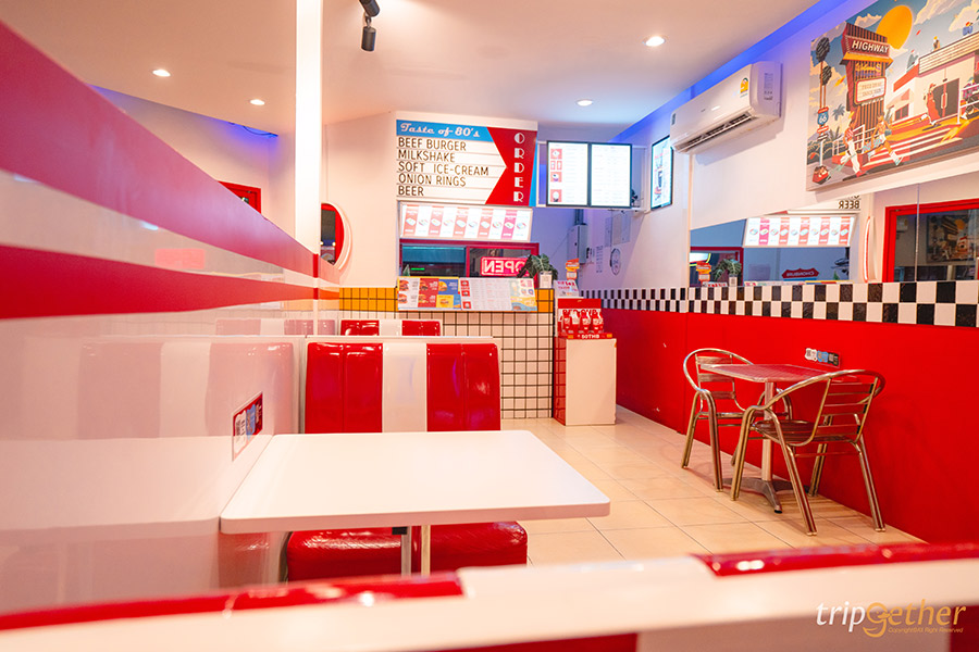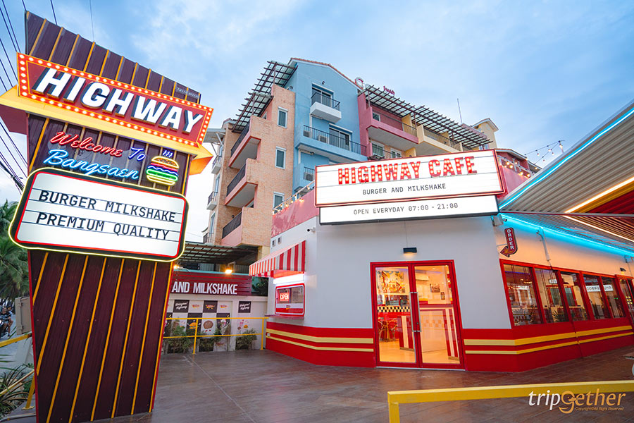 ไฮเวย์ คาเฟ่ (Highway Cafe) คาเฟ่ริมทะเลบางแสน ที่มาพร้อมกับบรรยากาศแบบอเมริกา ให้กลิ่นอายแบบเรโทรยุค 80 ฟีลวัยรุ่นอเมริกันแบบสุดๆ ตัวร้านเน้นโทนสีแดงเข้มโดดเด่นไม่ซ้ำใคร ภายในร้านยังคุมโทนความเป็นอเมริกันได้แบบเต็มร้อย เรียกได้ว่าตอบโจทย์สายคอนเทนต์แบบสุดๆ เพราะไม่ว่าจะโพสท่ายังไง ถ่ายรูปมุมไหน ก็สวยชิคไม่ซ้ำใคร ในส่วนเมนูอาหารของทางร้านเน้นเป็นอาหารสไตล์อเมริกัน ที่มีทั้งเบอร์เกอร์ เฟรนช์ฟรายส์ ออมเล็ต รวมทั้งเมนูเครื่องดื่มเติมความสดชื่นและความสนุกสนานอีกหลายเมนู ใครมาบางแสนแล้วได้รูปสวยๆ ไม่ซ้ำใคร ต้องมาที่นี่แล้ว