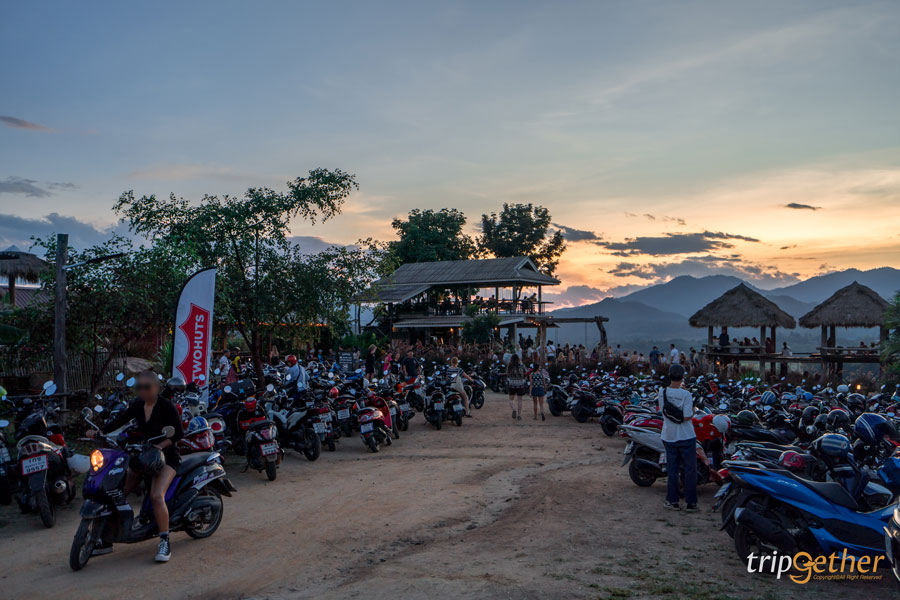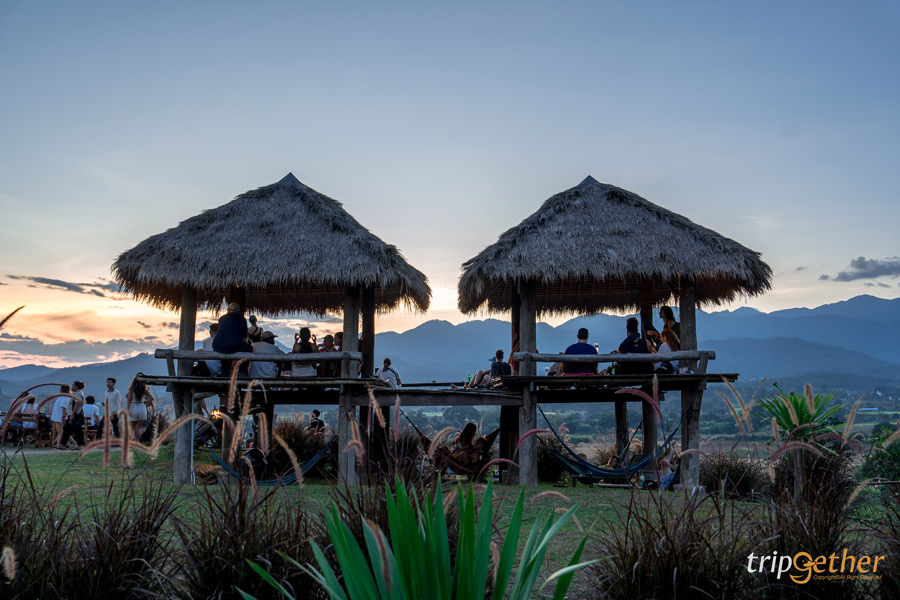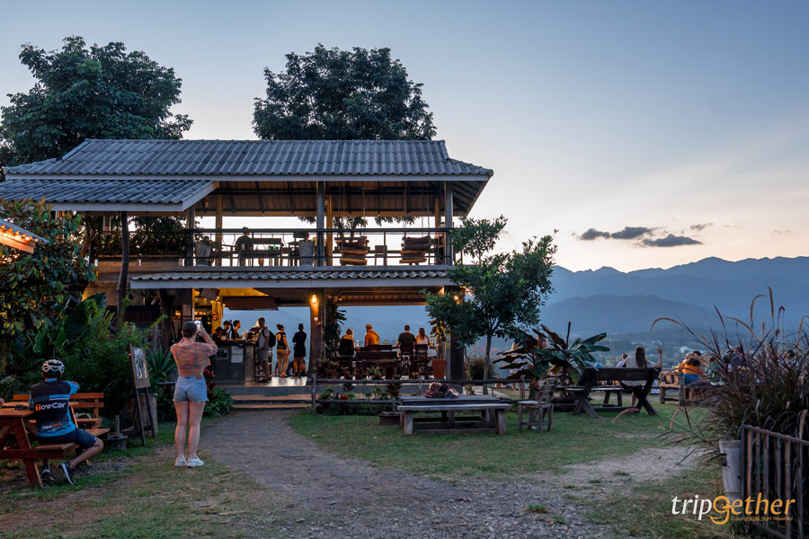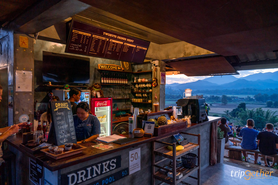 Two Huts Cafe จุดเช็คอินปายที่ฮอตมากๆ ในคนต่างชาติ บรรยากาศคึกคักขึ้นสุด แค่เห็นรถจอดหน้าทางเข้าร้านก็นึกว่าหลงมาอยู่ในงาน Festival แต่ก็ไม่แปลกใจว่าทำไมต่างชาติถึงชอบที่นี่ สำหรับคาเฟ่นี้ไม่ได้เป็นแค่ร้านนั่งดื่ม เพราะบรรยากาศและวิวทิวทัศน์คือดีมากจริงๆ ตัวคาเฟ่เป็นแบบเปิดโล่ง หันหน้าเข้าหาแนวภูเขาน้อยใหญ่ เห็นวิวแบบพาโนรามา รวมถึงไฮไลท์ คือ วิวพระอาทิตย์ตกดินที่สวยหลักล้าน ส่วนใครที่อยากได้ที่นั่งชิลล์ๆ วิวสวยๆ ก็ต้องรีบมาจับจองกันเร็วหน่อย (ก่อนพระอาทิตย์ตกดิน) ไม่งั้นที่นั่งเต็มหมดแน่นอน