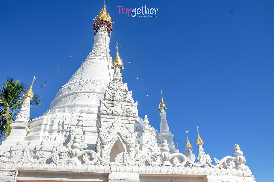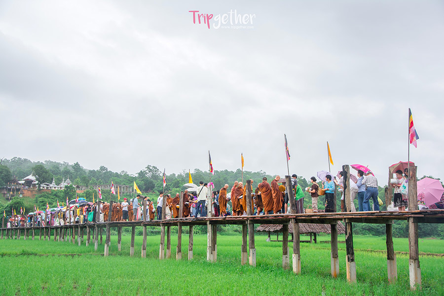 ซูตองเป้ เป็นภาษาไทยใหญ่ที่แปลว่า อฐิษฐานสำเร็จ และมีความเชื่อกันว่าหากมายืนอยู่กลาง สะพานซูตองเป้ แล้วอฐิษฐานก็จะประสบความสำเร็จ และไฮไลท์ของสะพานซูตองเป็ก็คือตัวสะพานจะทอดยาวผ่านบนทุ่งนาไปยังสวนธรรมภูสมะ ซึ่งถ้ายิ่งมาเที่ยวในช่วงเดือน กันยายน-ปลายเดือนตุลาคม ก็จะได้พบกับทุ่งนาสีเขียวขจี และกลางเดือนพฤศจิกายนทุ่งนาสีเขียวจะเปลี่ยนเป็นรวงข้าวสีทอง และห้ามพลาดที่จะมาร่วมทำบุญตักบาตรตั้งแต่เวลาประมาน 06.00 น.