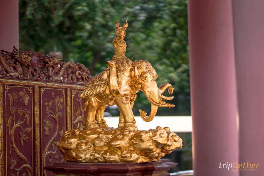 ต่อด้วย พระอินทร์ทรงช้างเอราวัณ ซึ่งประติมากรรมนี้แสดงท่าพระอินทร์กำลังทรงเทวพาหนะคู่พระทัยอย่างช้างเอราวัณ โบราณถือว่าพระอินทร์คือเทพแห่งสวรรค์ที่เชื่อกันว่าท่านเป็นผู้ประทานพรด้าน โชคลาภ ความร่ำรวย และอำนาจบารมี โดยจะใช้พวงมาลัยดาวเรือง และธูปในการกราบไหว้บูชาองค์ท่าน ใครที่อยากมีโชคมีลาภ แนะนำให้มาขอพรพระอินทร์ทรงช้างเอราวัณกันได้เลย