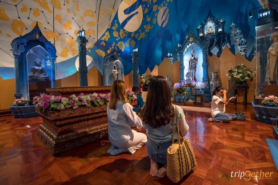 พาไปไหว้พระพุทธรูปทั้ง 3 ยุค ภายในท้องช้างเอราวัณ ที่ตกแต่งเป็นผังที่ตั้งเขาพระสุเมรุ ซึ่งในไตรภูมิกล่าวว่าเป็นศูนย์กลางของจักรวาล ประดิษฐาน พระพุทธสิหิงค์จำลอง และ พระพุทธรูปปางลีลา นอกจากนี้ได้จัดแสดงพระพุทธรูปโบราณสมัยต่างๆ อีกด้วย บรรยากาศเงียบสงบ ล้อมด้วยจิตรกรรมสวยมาก ซึ่งทางพิพิธภัณฑ์มีบริการเช่าชุดไทยถ่ายรูปนะ สายคอนเท็นต์ห้ามพลาดเลย