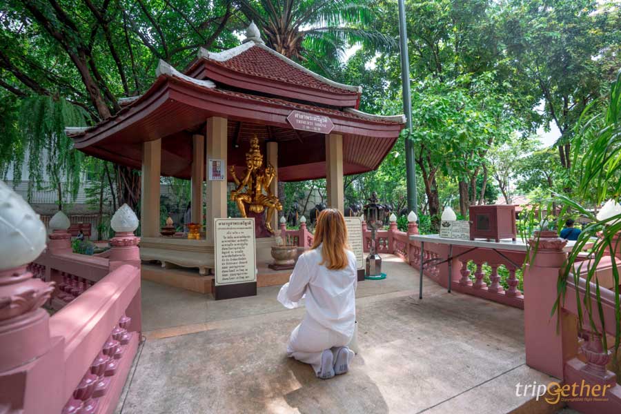 มาถึง จุดไหว้ในพิพิธภัณฑ์ช้างเอราวัณ จุดที่ 4 ขอพรแบบรอบด้าน กับ พระพรหม เชื่อกันว่าหากมากราบขอพรกับพระพรหมก็จะทำให้พบแต่ ความสุขและสมบูรณ์ในชีวิต เพราะคนอินเดียเชื่อว่าพระพรหมทรงสร้างจักรวาลขึ้นมา รวมถึงสร้างความเจริญรุ่งเรืองให้แก่โลก และท่านมีเมตตาและพร้อมประทานพรให้ทุกด้านเลยล่ะ ใช้พวงมาลัยดาวเรือง และธูปในการกราบไหว้ ตอนขอพรอย่าลืมไหว้ครบทั้ง 4 หน้า ให้พรครอบคลุมรอบด้าน แล้วบอกชัดๆ ว่าอยากได้อะไร