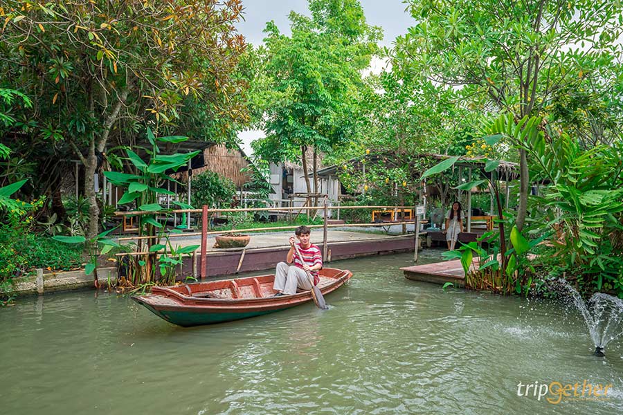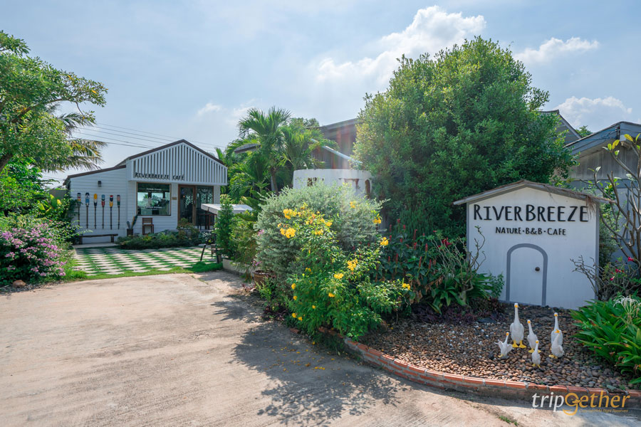 ก่อนกลับแวะมาพักผ่อนสบายๆ กันที่ ริเวอร์บรีซ คาเฟ่ ที่เป็นทั้งที่พักและคาเฟ่ริมน้ำสุดชิลล์มาพร้อมกับการตกแต่งสไตล์ Beach-House ให้บรรยากาศแบบอยู่ริมชายหาด โดยตัวร้านที่เป็นอาคารหลังเล็กจะตกแต่งให้บรรยากาศความเป็นชายหาดด้วยอุปกรณ์ที่สื่อถึงทะเลอย่างไม้พายและเซิร์ฟบอร์ด ภายในตัวร้านก็จะมีกระจกบานใหญ่ที่มองออกไปเห็นทางเดินไม้ที่ทอดยาวไปสู่ริมแม่น้ำ พร้อมกับแสงอาทิตย์ที่สะท้อนน้ำระยิบระยับสวยงาม รวมทั้งความเขียวขจีของต้นไม้ฝั่งตรงข้าม บอกเลยว่าเป็นสถานที่ปล่อยใจสบายๆ ได้แบบชิลล์ๆ ใกล้กรุงเทพ