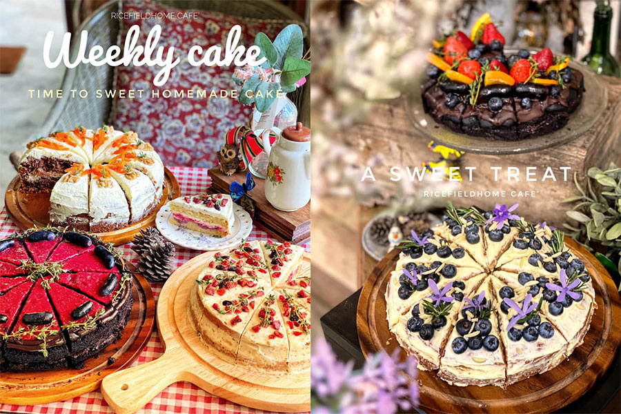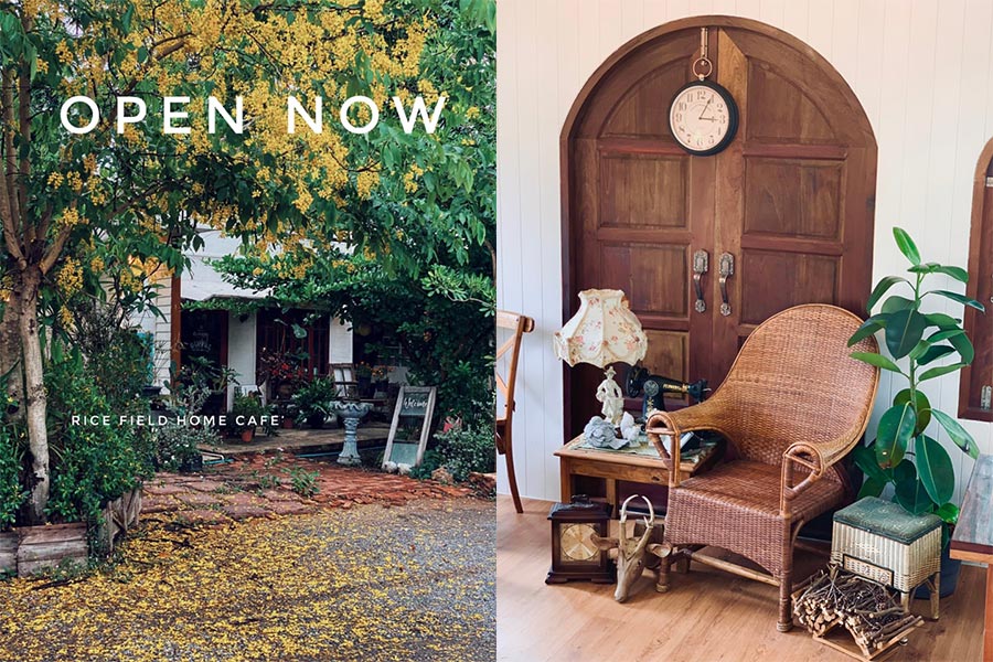 Rice Field Home Farm Stay & Cafe เป็นทั้งโฮมสเตย์และคาเฟ่ ที่มีการออกแบบในสไตล์อังกฤษชนบท ตัวอาคารเน้นสีขาวที่ดูเรียบง่ายตัดด้วยกรอบประตู หน้าต่างและเฟอร์นิเจอร์ไม้ ภายในร้านตกแต่งด้วยของกระจุกกระจิกและของสะสมมากมาย ดูน่ารักและให้กลิ่นอายความเป็นอังกฤษ ทำให้บรรยากาศดูอบอุ่นและสบายตาไปกับธรรมชาติที่แวดล้อมอยู่รอบร้านคาเฟ่ สามารถถ่ายรูปสวยๆ ได้ทุกมุม ในส่วนขนมเบเกอรี่ของทางร้านก็เป็นแบบโฮมเมดที่มีหน้าตา สีสันสดใส ดูน่ากินและครีเอทมากๆ รวมถึงเครื่องดื่มก็มีให้เลือกมากมาย นอกจากนี้ยังมีของอาหารคาวแบบไทยฟิวชั่นที่ปรุงอย่างพิถีพิถันและจากวัตถุดิบคุณภาพดี