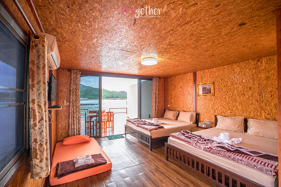 Sweet Home Floating House โฮมเสตย์กลางน้ำกาญจนบุรี ที่ใช้แนวคิดแบบเศรษฐกิจพอเพียง การตกแต่งโดยใช้วัสดุจากธรรมชาติ ทั้งโต๊ะเก้าอี้รวมถึงของตกแต่งต่างๆ สำหรับห้องพักแบ่งเป็น 3 โซน โซนแรก มี 4 ห้อง เตียงเดี่ยว 2 ห้อง เตียงคู่ 2 ห้อง โซนแพกลาง มี 2 ห้อง และแพกระชังปลา 3 ห้อง ใช้ห้องน้ำรวมของแต่ละโซน ด้านหน้าห้องพักมีบริเวณที่นั่งเล่นหน้าห้อง พร้อมหนังสือและเกมส์ฝึกสมอง มีอาหารแบบบ้านๆ ที่ให้เราได้นั่งล้อมวงกินกันอย่างอบอุ่น ตอนเช้าก็มีข้าวต้มและจุดบริการสำหรับชงชา กาแฟ โอวัลติน และขนมทานคู่กัน สำหรับไฟฟ้าที่นี่เป็นแบบโซลาร์เซลล์ซึ่งหากจะชาร์จแบตมือถือหรือโน้ตบุ๊ก ก็ต้องมาเสียบปลั๊กในจุดที่จัดไว้ สวีทโฮมเหมาะแก่การมาพักผ่อนและรีชาร์จความสุขอย่างแท้จริง
