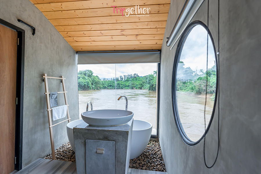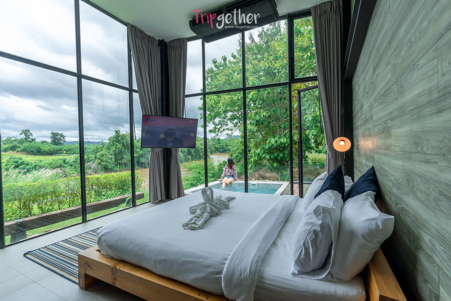 VeeVaree Riverkwai Resort ที่พักสไตล์ luxury modern โซนไทรโยค เงียบสงบโอบล้อมด้วยธรรมชาติติดริมแม่น้ำแควน้อย ไฮไลท์อยู่ที่ทุกหลังสามารถเห็นวิวโค้งน้ำ 180 องศา ให้คุณใช้วันหยุดพักผ่อนดื่มด่ำบรรยากาศดีๆ ฟังเสียงน้ำไหล เพื่อชาร์จแบตตัวเองให้เต็มร้อยจากวันที่เหนื่อยล้า ส่วนของห้องพักมีให้เลือก 2 สไตล์ คือ RiverLux แพริมน้ำดีไซน์สวยสะดุดตา ทรงโค้งขนาด 70 ตารางเมตร ด้านในกว้างขวาง ตกแต่งอย่างดี มีโซฟาเดี่ยวให้เอนกายมองวิวแม่น้ำได้อย่างสบายๆ และมีพื้นที่ของชั้นลอยสำหรับแก๊งค์เพื่อนหรือครอบครัวคนที่ต้องการเสริมที่นอนอีกด้วย ไม่เท่านั้นห้องนี้ยังมาพร้อมระเบียงหน้าห้องส่วนตัวที่มีอ่างให้แช่น้ำตีฟองมองวิวแบบฟินๆ อีกสไตล์คือห้องพัก VeeLux บนฝั่งที่มาพร้อมระเบียงหน้าห้องสามารถมองเห็นวิวโค้งน้ำได้อย่างสวยงาม ภายในตกแต่งเน้นโทนสีเขียวสุดคลาสสิกเพื่อให้เข้ากับธรรมชาติ ซึ่งมีให้เลือกทั้งแบบ super king size และ twin bed ไม่ว่าจะมาเป็นคู่กับแฟนหรือเพื่อนก็เช็คอินได้สบายๆ และสำหรับคนที่ชื่นชอบ activity ทางที่พักมีให้เลือกทำมากมายคือ ล่องแพเปียก พายเรือคายัค ขับรถ buggy ขี่ช้าง และปั่นจักรยาน ใครกำลังแพลนเที่ยวกาญจนบุรีแล้วมองหาที่พักดีไซน์สวยริมแม่น้ำแคว ทริปต่อไปแนะนำ VeeVaree Riverkwai Resort มาแล้วถูกใจแน่นอน และพิเศษสุดๆ กรอกโค้ด vvrtripgt23 ได้รับส่วนลดเต็มๆ 300 บาท