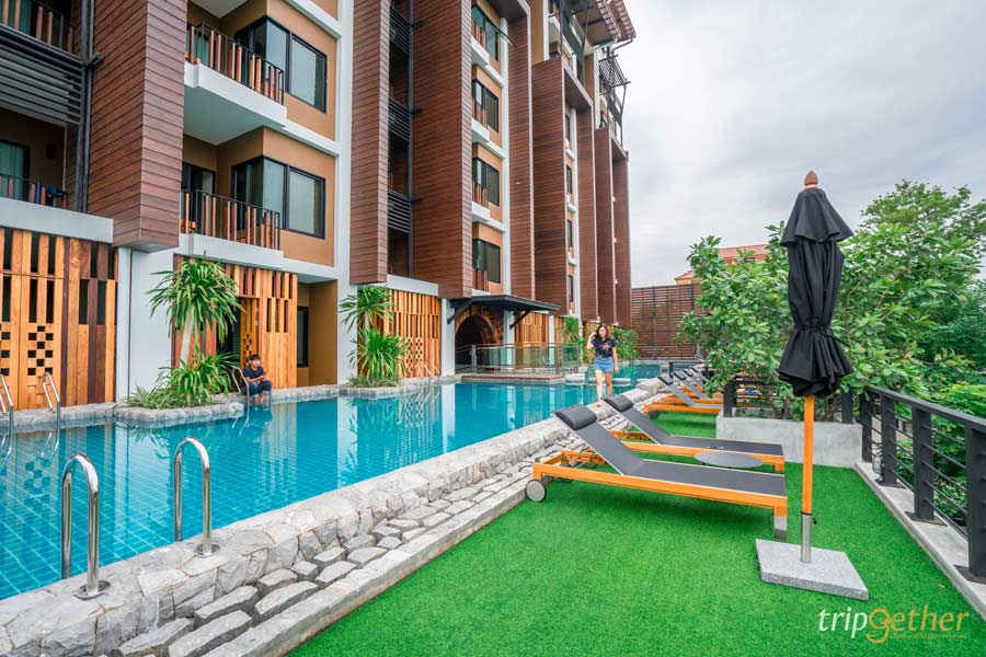 ใครที่หลงรักต้นไม้เขียวชอุ่มและความเงียบสงบ ต้องมาเช็คอินที่ โมนาซ ริเวอร์แคว (Monaz River Khwae Hotel Kanchanaburi) ที่พักสวยสไตล์โมเดิร์นลอฟท์ ใจกลางเมืองกาญจนบุรี ห้องพักแต่ละห้องจัดตกแต่งอย่างเป็นระเบียบสวยงามด้วยเฟอร์นิเจอร์และสิ่งอำนวยความสะดวกครบ บอกเลยว่าที่นี่บรรยากาศดีสุดๆ ถ่ายรูปสวยๆ ได้ทุกมุม แถมมีสระว่ายน้ำไว้ตรงกลางเป็นรูปตัว U ให้ว่ายเล่นกันเพลินๆ