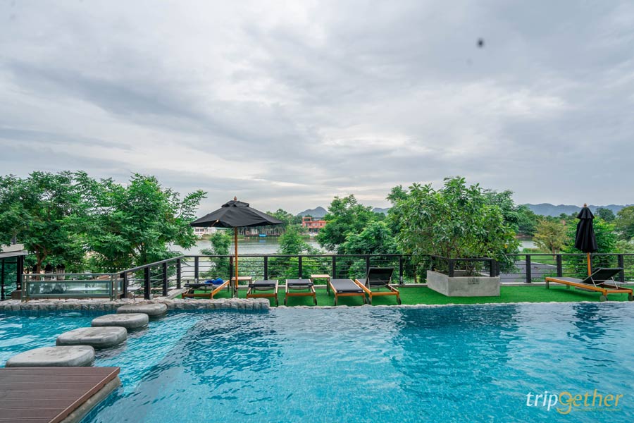 มาเริ่มกับ ที่พักกาญจนบุรี ในตัวเมือง พิกัดแรก นที เดอะ ริเวอร์ฟร้อนท์ (Natee The Riverfront Hotel Kanchanaburi) ตั้งอยู่ริมแม่น้ำแคว ใกล้ชิดกับธรรมชาติ แถมใกล้กับสถานที่ท่องเที่ยวสำคัญ อย่าง สุสานทหารผ่านศึกสัมพันธมิตรดอนรัก และ สะพานข้ามแม่น้ำแคว ตัวที่พักดีไซน์สวยและโดดเด่นด้วยการออกแบบสไตล์ไทยร่วมสมัย มีกลิ่นอายความเป็นทรอปิคอล มีห้องพักให้เลือก 3 แบบด้วยกัน โดยแต่ละห้องจะมีระเบียง อ่างจากุชชี่ สิ่งอำนวยความสะดวกต่างๆ ครบครัน ไฮไลท์สำคัญคือสามารถมองเห็นวิวแม่น้ำได้ทุกห้องพักเลยล่ะ นอกจากนี้ทางที่พักยังมีฟิตเนส ห้องอาหารริมน้ำ และสระว่ายน้ำส่วนกลางขนาดใหญ่ให้ได้ว่ายเล่นกันเพลินๆ