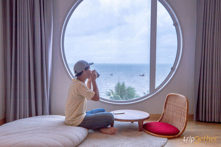 เริ่มต้น ที่พักบางแสน วิวทะเล พิกัดแรก ตั้งอยู่บริเวณหาดวอนนภา นั่นก็คือ มาริน่าซีวิว บางแสน (Marina Sea View Bangsaen) มาพร้อมห้องพักสุดคิวท์ตกแต่งสไตล์มินิมอล มีกลิ่นอายความเป็นญี่ปุ่น เน้นใช้โทนสีสะอาดตา ดูเป็นธรรมชาติเรียบง่ายสบายตา มีหน้าต่างวงกลมกระจกที่สามารนั่งมองวิวทะเลบางแสนได้จากบนเตียงเลย ยิ่งในช่วงพระอาทิตย์กำลังตกบอกเลยว่าวิวสวยใจฟูมาก ในส่วนของด้านล่างที่พักจะมีคาเฟ่ชิคๆ ให้บริการด้วยนะ