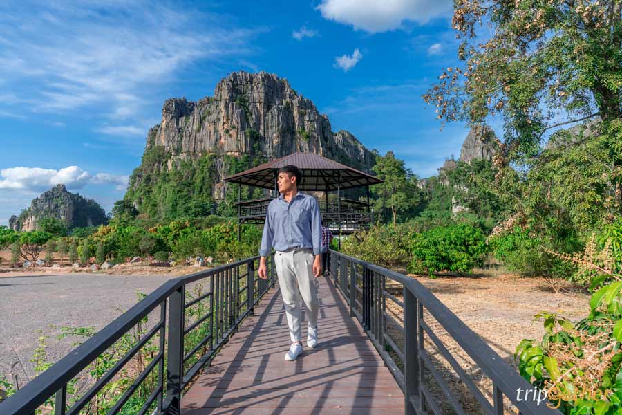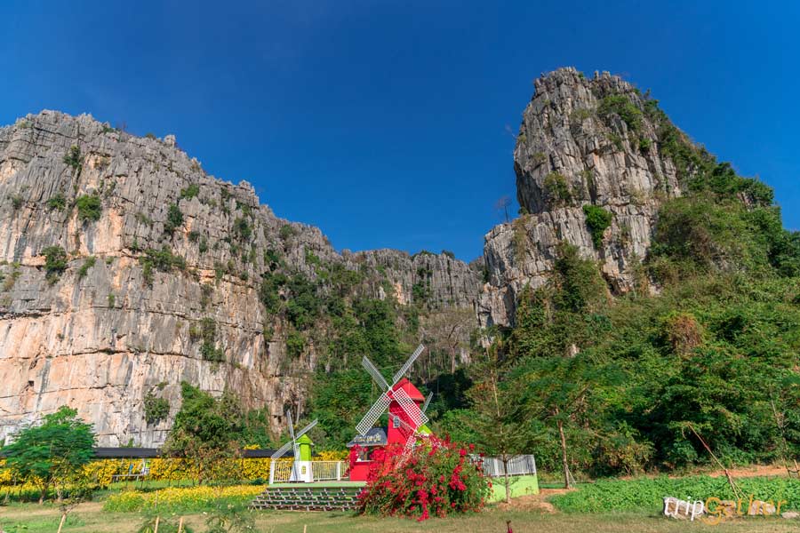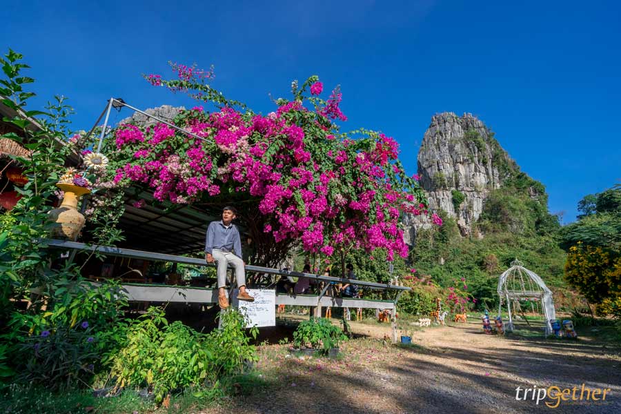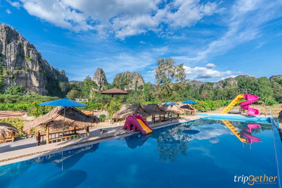 และไปต่อกันที่ ผาใกล้รุ่ง (Phakairung) ที่พักสวยแห่งบ้านมุง ที่ล้อมรอบไปด้วยภูเขาหินปูนใกล้ชิดธรรมชาติมากๆ ที่นี่เป็นทั้งจุดเช็คอิน ที่กิน ที่เที่ยวสามารถแวะเข้ามาชมดอกไม้สีสันสดใส พร้อมถ่ายรูปสวยๆ เดินเล่นชมวิวได้เลย สำหรับห้องพักของที่นี่มีทั้งแบบเป็นห้องพักและเป็นหลังแยกออกมา แอบกระซิบว่าจำนวนห้องมีไม่เยอะมากนะ แนะนำโทรจองล่วงหน้า และสำหรับไฮไลท์ของผาใกล้รุ่งเลยก็คือสระว่ายน้ำท่ามกลางป่าเขา บอกเลยว่าฟีลดีมาก