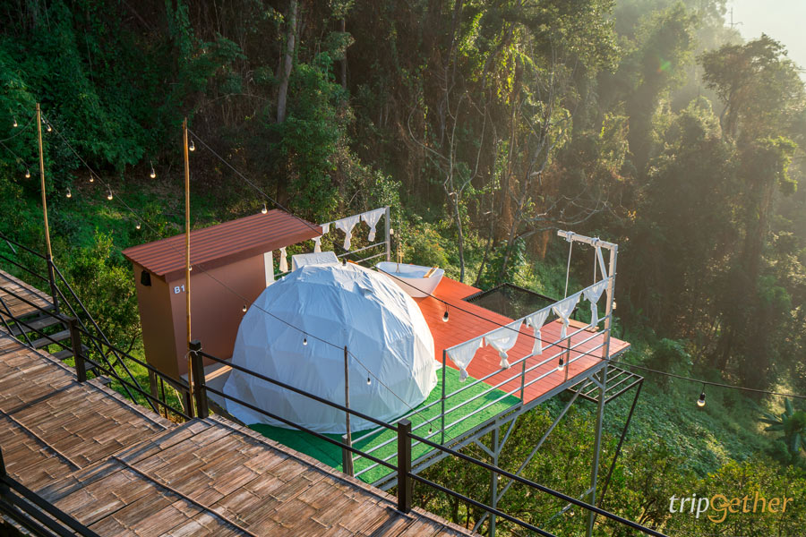 ไร่ส้มแบงค์ดอย ที่พักบนแม่แตงอยู่ในไร่ส้มให้เราได้เดินชมสวนได้เลยและสามารถมองเห็นวิวธรรมชาติได้แบบมุมกว้างที่มีทั้งห้องพักแบบสไตล์โมเดิร์นและแบบเต็นท์โดม ส่วนไฮไลท์ที่นี่ คือเต็นท์โดมอ่างอาบน้ำ ชิงช้า และเปลตาข่าย ให้ได้นอนชมบรรยากาศแบบชิลล์ๆ เลยเพราะหมอกสวยบวกกับความสวยงามของธรรมชาติแบบกรีนๆ ผ่อนคลายสุดๆ แถมยังมีสิ่งอำนวยความสะดวกครบครัน มีห้องน้ำส่วนตัวอยู่ด้านข้างเต็นท์สะดวกสบายมากๆ กระชิบบอกว่าอากาศเย็นๆ แบบนี้สั่งหมูกระทะมากินหน้าเต็นท์ฟินสุดๆ บอกเลยว่าแนะนำมากๆ