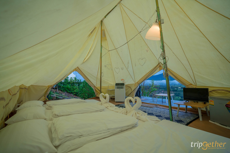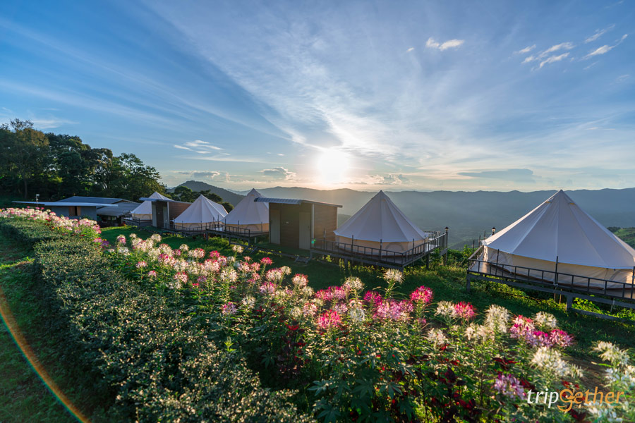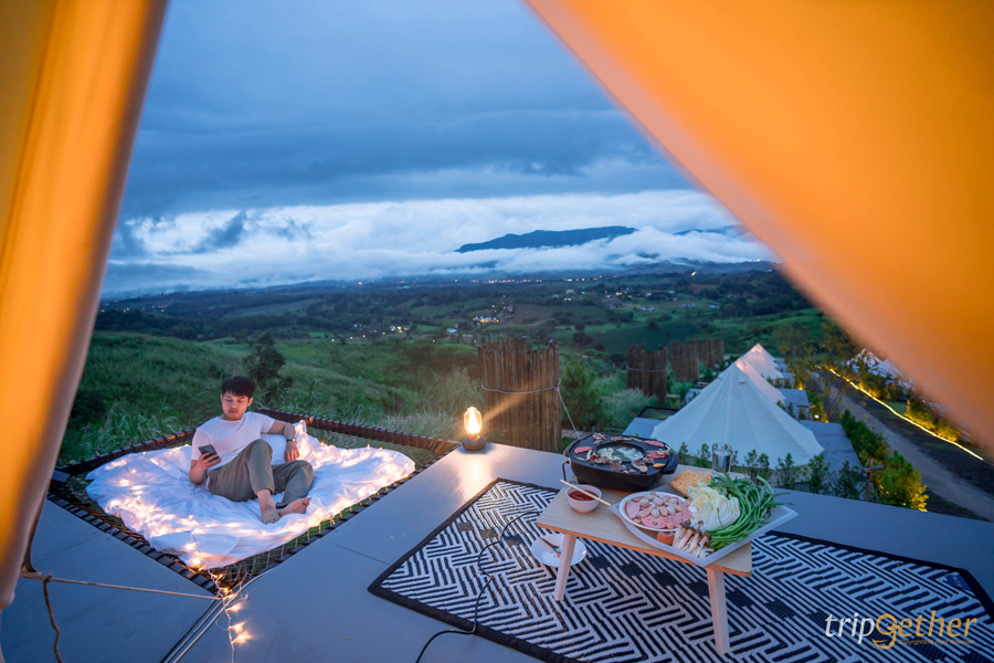 ภูทองแคมป์ สไตล์แคมป์ปิ้งที่บรรยากาศที่โอบล้อมไปด้วยธรรมชาติ และตั้งอยู่บนเนินเขาทำให้มองเห็นภูเขาในวิวพาโรนามาแบบเต็มๆ ทั้งท้องฟ้าที่สวยงามและต้นไม้ที่เขียวขจีล้อมรอบให้เราได้ดื่มด่ำกับธรรมชาติ ไปพร้อมกับการพักผ่อนแบบชิลล์ๆ แถมที่พักยังมีอากาศเย็นสบายตลอดทั้งปีมาพักช่วงไหนก็ฟินแน่นอน รอบๆ บริเวณภูทองแคมป์ยังมีดอกไม่ขึ้นเต็มไปหมดร่มรื่นสีสันสดใสมากๆ สำหรับห้องพักโซนเต็นท์มีทั้งหมด 2 โซน ได้แก่ โซนด้านบนที่เป็นเต็นท์โดมใสและโซนด้านล่างที่เป็นเต็นท์กระโจม ให้เราเลือกตามความชอบได้เลย สิ่งอำนวยความสะดวกก็พร้อมมากมีห้องน้ำในตัวทุกห้อง บอกเลยว่าใครที่อยากมาพักแบบที่เที่ยวแบบธรรมชาติแบบนี้ต้องรีบมากันเลยไม่ผิดหวังแน่นอน
