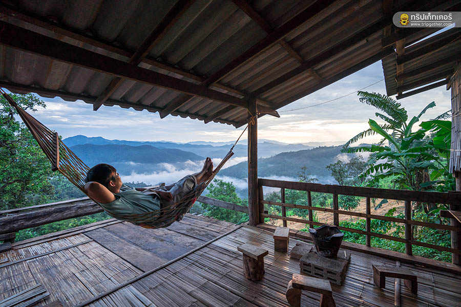 ห้วยกุ๊บกั๊บ โฮมสเตย์ โฮมสเตย์ในหมู่บ้านห้วยกุ๊บกั๊บ ที่เหมาะสำหรับนักท่องเที่ยวสาย Backpack ตัวบ้านพักสร้างจากไม้และมีห้องใหญ่ให้นอนรวมกันเพียงห้องเดียวเท่านั้น ภายในห้องมีที่นอน หมอน และมุ้ง จัดเตรียมไว้ให้พร้อม หรือใครที่อยากเปลี่ยนบรรยากาศก็สามารถพกเต็นท์มากางเองที่ระเบียงบ้านได้อีกด้วย ไฮไลท์ของโฮมสเตย์คงหนีไม่พ้นมุมระเบียงและมุมที่นอนเปล เพราะเป็นจุดที่สามารถมองเห็นวิวได้แบบ 180 องศา อาหารมื้อเย็นของโฮมสเตย์เป็นเมนูบ้านๆ ที่เสิร์ฟมาบนขันโตกมีทั้ง น้ำพริกลาหู่ แกงฟักทอง ไข่เจียว และผัดหน่อไม้ ซึ่งราคาค่าอาหาร 2 มื้อ (เช้า-เย็น) รวมอยู่ในค่าที่พักทั้งหมดแล้ว ในราคา 390 เรียกว่าเกินคุ้มมากๆ กับบรรยากาศและวิวที่ได้ในราคาแค่หลักร้อย