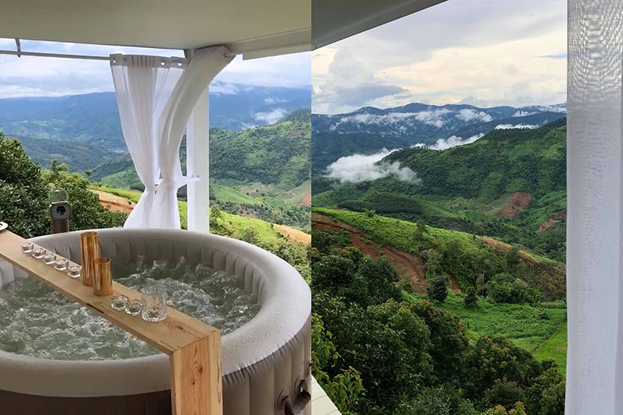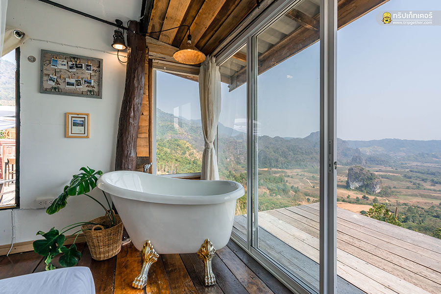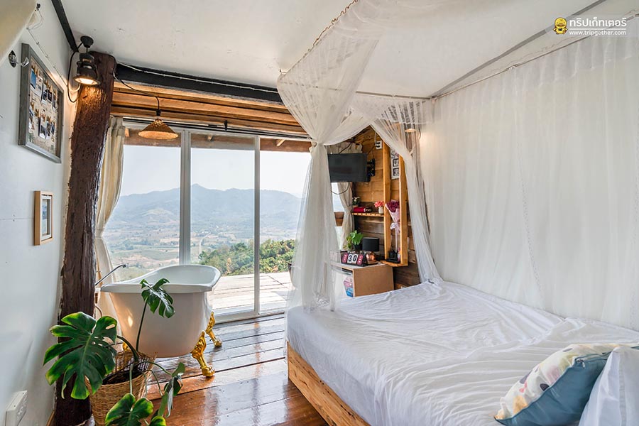 เมจิก เมาน์เทน ที่พักที่ตกแต่งด้วยสไตล์กึ่งรัสติกที่ตั้งอยู่บนเนินเขาหันหน้าออกสู่วิวสุดอันซีน สำหรับห้องพักของที่นี่มีเพียง 2 ห้องเท่านั้นและยิ่งไปกว่านั้นคือที่นี่รับลูกค้าเพียงวันละกรุ๊ป! เรียกได้ว่าเอ็กซ์คลูซีฟสุดๆ ใครที่กำลังมองหาสถานที่สุดโรแมนติกสำหรับพาแฟนมาฮันนีมูนบอกเลยที่นี่ตอบโจทย์สุดๆ ภายในห้องพักก็ตกแต่งได้อย่างน่ารักในสไตล์วินเทจ เน้นโชว์งานไม้แบบดิบๆ และมาพร้อมสิ่งอำนวยความสะดวกครบครันไม่ว่าจะเป็น ทีวี พัดลมไอเย็น ตู้เย็นและของตกแต่งกระจุกกระจิกที่เอามาเป็นพร็อพสวยๆ สำหรับถ่ายรูปได้ และที่เรียกได้ว่าเป็นไฮไลท์ของที่นี่เลยก็คืออ่างอาบน้ำในห้องนอนที่สามารถนอนแช่น้ำพร้อมชมวิวหลักล้านผ่านกระจกได้แบบฟินๆ หรือยามเย็นจะออกมานั่งเล่นที่ระเบียงน่าห้องก็รับรองว่าชิลล์ๆ สุดๆ ไปเลย