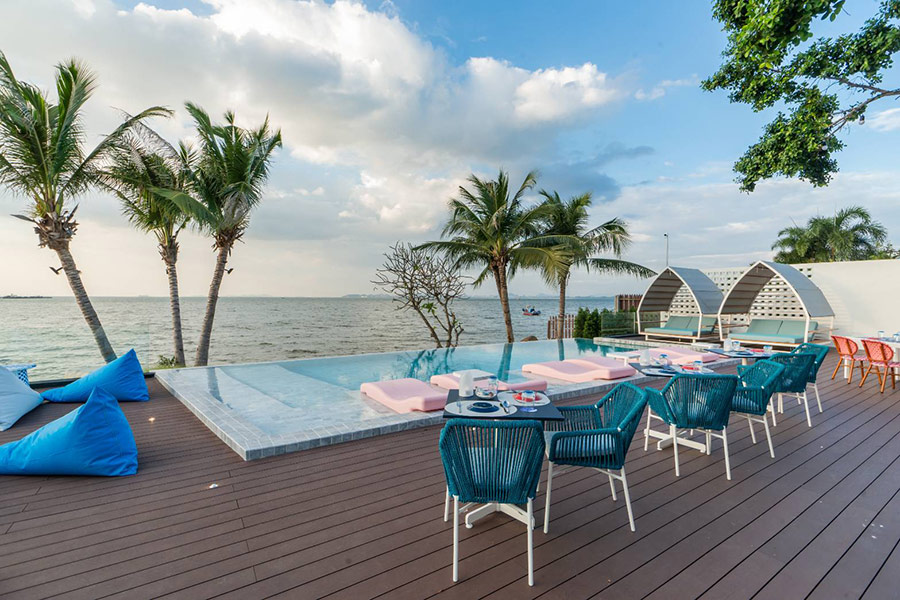 Kept Bangsaray Hotel Pattaya วิลล่ากลางทะเล ตกแต่งหลังคาเป็นทรงกลมสีน้ำตาล ให้ฟีลเหมือนไปมัลดีฟส์แต่อยู่ใกล้แค่พัทยาเท่านั้น ที่นี่มีห้องพักทั้งแบบริมชายหาดและกลางทะเล ภายในตกแต่งเน้นโทนฟ้าขาวสบายตา มีห้องพักให้เลือกทั้งหมด 8 แบบ 8 สไตล์ ถ้าใครชอบมองวิวแบบพาโนรามาก็ต้องเลือกห้อง Kept Horizon ที่อยู่ชั้นบนสุด มีระเบียงกว้างๆ ให้ออกไปนั่งชมวิว หรือถ้าใครชอบเล่นน้ำ ก็แนะนำเป็นห้อง Kept Skyline Suite ห้องพักที่มาพร้อมอ่างอาบน้ำริมระเบียง แช่ตัวชมวิวได้แบบเพลินๆ ส่วนใครชอบความเป็นส่วนตัวก็ต้อง Kept Water Villa วิลล่าทรงกลมยื่นออกไปกลางทะเล มีเพียง 3 หลังเท่านั้น สงบและเป็นส่วนตัวสุดๆ นอกจากนี้ที่พักยังมีบริการส่วนกลางอย่างสระว่ายน้ำ สะพานไม้ให้ออกไปเดินเล่นถ่ายรูป แถมยังมีร้านอาหารและคาเฟ่ด้วยนะ
