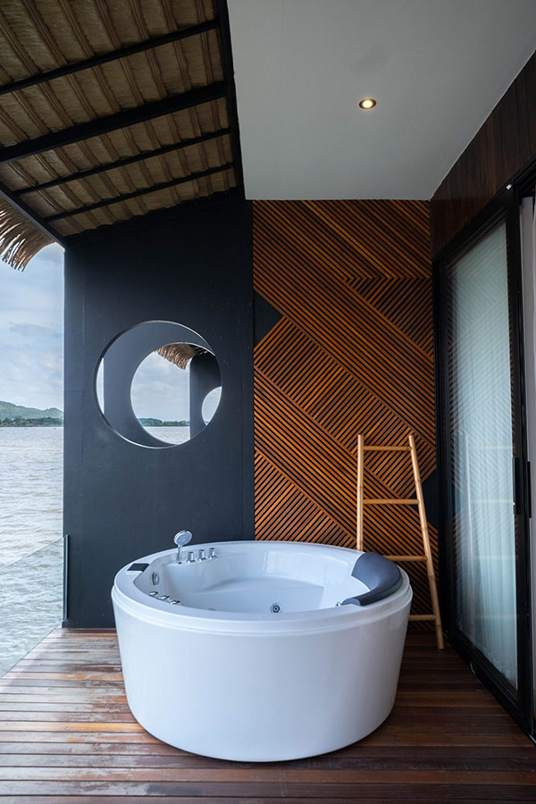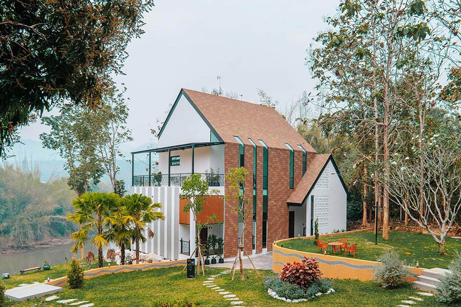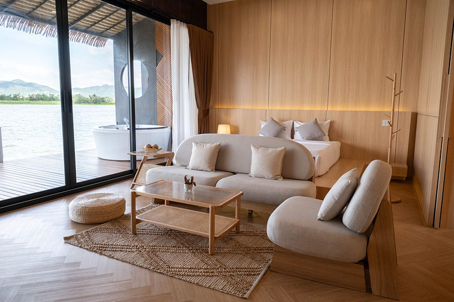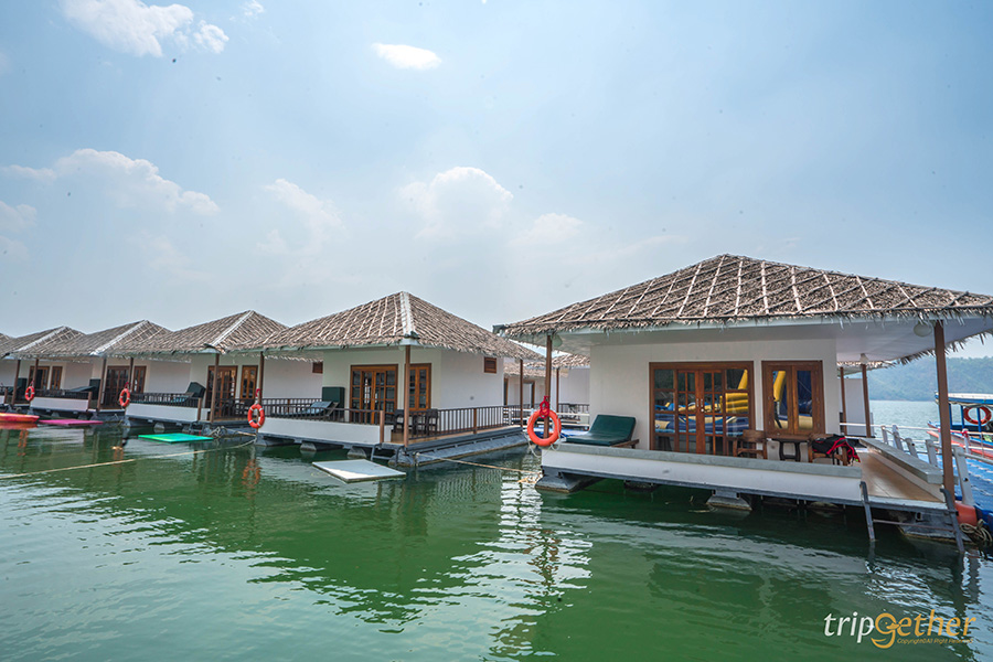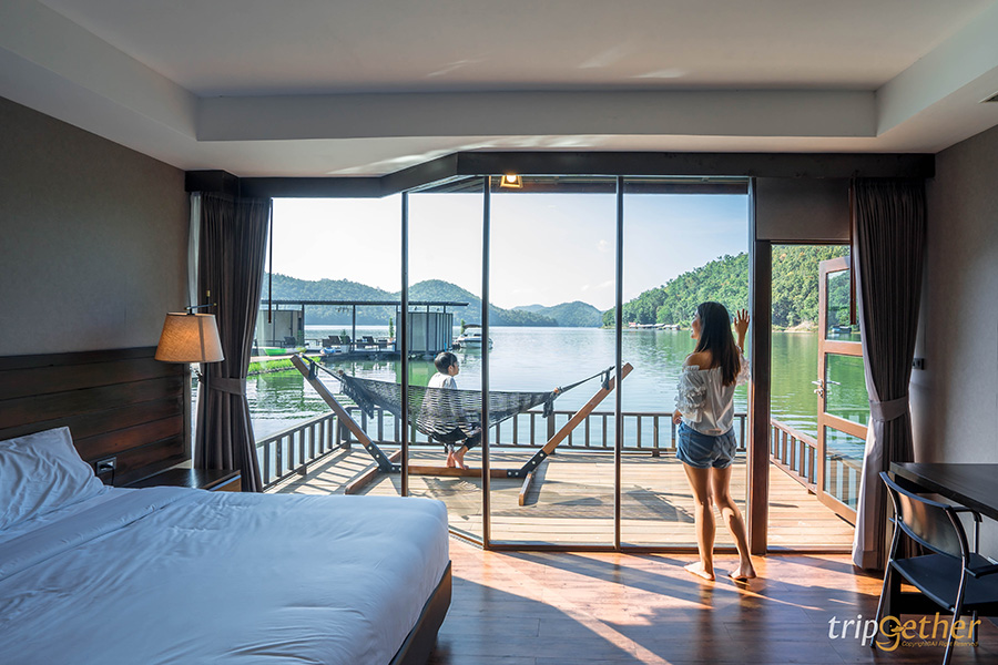 The FloatHouse River Kwai l Floating Resort ที่พักแพกาญจนบุรีแบบวิลล่าลอยน้ำสุดโดดเด่น มาพร้อมกับการออกแบบด้วยสไตล์ Contemporary Boutique Folk Style ที่ผสมผสานศิลปะตะวันออกเข้ากับศิลปะพื้นถิ่นที่มีเอกลักษณ์อย่างวัฒนธรรมมอญ ในส่วนของห้องพักมีอยู่ทั้งหมด 30 หลังกันเลยทีเดียว ซึ่งห้องพักทั้งหมดจะเป็นแบบ Floating Villa ที่ภายในห้องนอกจากจะมีความเป็นส่วนตัวแล้ว ยังจัดเต็มความเป็นธรรมชาติผ่านวัสดุที่ใช้ อีกทั้งยังออกแบบได้อย่างเรียบหรู มีความเป็นศิลปะ และมีสิ่งอำนวยความสะดวกครบครัน ห้องน้ำของวิลล่าแต่ละหลังเป็นแบบกึ่งเอาท์ดอร์ (Semi Outdoor) มีฝักบัวแบบ Rain Shower เพื่อให้ผู้เข้าพักได้ผ่อนคลายราวกับได้อาบน้ำท่ามกลางธรรมชาติ ไฮไลท์อีกหนึ่งอย่างก็คือวิลล่าทุกหลังจะมีระเบียงด้านหน้าที่สามารถออกมานั่งเอาเท้าแช่น้ำ ชมวิวแม่น้ำและหน้าผาได้แบบพาโนราม่าอีกด้วย หรือจะลงเล่นน้ำจากระเบียงก็ดีไม่แพ้กัน วิลล่าว่าดีแล้ว ที่นี่ยังมีห้องอาหารลอยน้ำ “พอนทูน” (Pontoon Restaurant) ที่มีวิวหน้าผาหินงอกหินย้อยให้ชม รวมทั้งยังมีกิจกรรมให้ทำเพียบ ไม่ว่าจะเป็นการศึกษาธรรมชาติ พายเรือแคนู พายซับบอร์ด ล่องแพไม่ไผ่ ล่องเรือชมธรรมชาติ และกิจกรรมสนุกๆ อีกมากมาย ใครที่กำลังมองหาสถานที่ที่ตอบโจทย์การพักผ่อนครบทุกด้านทั้งธรรมชาติ ความสวยงาม ศิลปะ และกิจกรรม ขอแนะนำ The FloatHouse River Kwai l Floating Resort