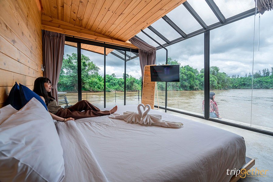The Tryst River Kwai ที่พักริมแม่น้ำแควน้อยเน้นการตกแต่งสไตล์โมเดิร์นลอฟท์ มีห้องพักบนแพให้เลือกพักทั้งหมด 5 แบบคือ Panoramic River Vibe เป็นห้องพักที่สามารถเข้าพักได้ตั้งแต่ 2 – 6 คน ห้องพักอยู่ริมสุดของแพสามารถมองวิวสวยๆ ของธรรมชาติได้แบบพาโนรามา พร้อมกับ Moon Roof บนชั้นลอยสามารถมองเห็นวิวของท้องฟ้ายามค่ำคื่นและนอนแช่อ่างได้ชิลล์ๆ, River Vibe, Panoramic River Scene, River Scene และ Panoramic River Scene (Pool View) สำหรับห้องพักบนฝั่งริมน้ำที่นี่ก็มีให้บริการเช่นกัน ใครชอบฟีลไหนก็สามารถเลือกพักผ่อนได้ตามสบายเลย เป็นอีกหนึ่งที่พักสุดชิคที่บอกเลยว่าหนุ่มสาวไม่ควรพลาด!