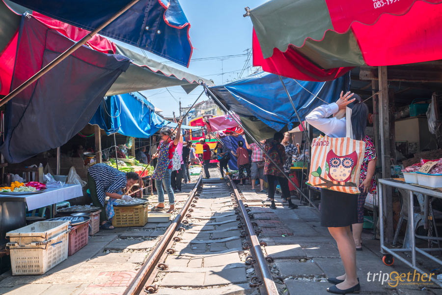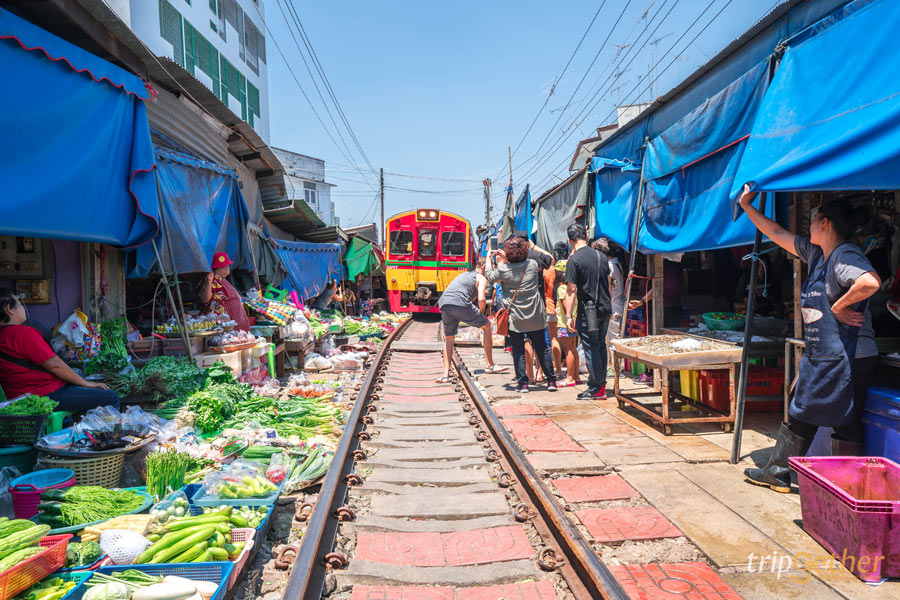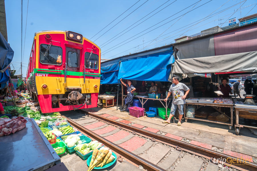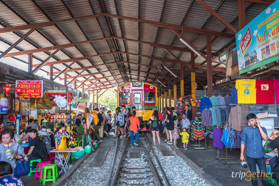 ตลาดร่มหุบแม่กลอง เรียกได้ว่าเป็นอีกหนึ่งที่เที่ยวสมุทรสงครามที่อันซีนสุดๆ เพราะไม่มีให้ดูที่ไหนอีกแล้วนอกจากที่นี่ เป็นตลาดที่มีรางรถไฟผ่าตรงกลาง และเวลารถไฟมา บรรดาพ่อค้าแม่ค้าก็จะรีบหุบร่มกับ เป็นที่ตื่นตาตื่นใจของนักท่องเที่ยวมาก ถ้าใครอยากเห็นตอนรถไฟเคลื่อนตัวผ่านกลางตลาด ก็ต้องมาตามเวลานี้เลย รถไฟเข้าสถานีแม่กลองเวลา 08.30, 11.10, 14.30, 17.40 น. และออกจากสถานีแม่กลองเวลา 06.20, 09.00, 11.30, 15.30 น.