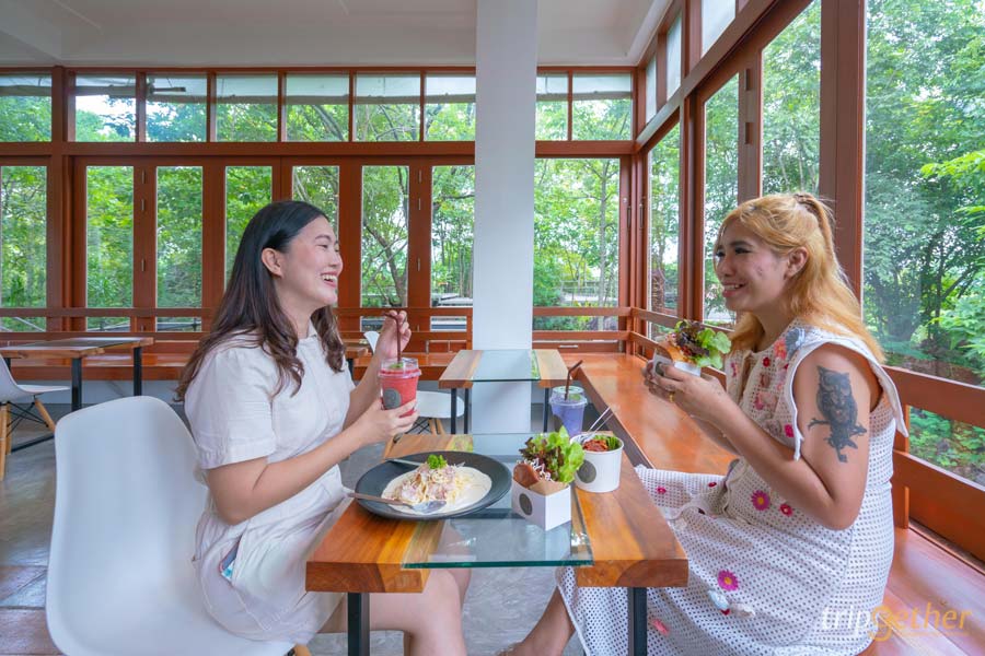 ปิดท้าย ร้านอาหารกินดื่มเขาใหญ่ ที่เอาใจสายลุยสุดๆ เพราะ แรปโซเดีย คาเฟ่ ตั้งอยู่ใน Rapsodia Park จุดเช็คอินเขาใหญ่ที่เต็มไปด้วยกิจกรรมสุดแอดเวนเจอร์ โดยบรรยากาศของคาเฟ่บนเนินเขาแห่งนี้รายล้อมไปด้วยต้นไม้และธรรมชาติ ภายใต้คอนเซ็ปต์ คาเฟ่ in the woods มีให้เลือกนั่งทั้งโซนอินดอร์และโซนเอาท์ดอร์ นั่งพักผ่อนจิบกาแฟใต้ร่มไม้ ชมทิวทัศน์มุมสูงสามารถมองเห็นเขายายเที่ยงเลยด้วยนะ เมนูของที่ร้านก็มีให้เลือกมากมายทั้งเครื่องดื่ม อาหาร ขนมหวานจุกจิก ของกินเล่นรองท้อง ทีเด็ดอยู่ที่เมนู Twist ที่ผสมผสานความเป็นไทย ความเป็นจีน และตะวันตกเข้าด้วยกันให้กลายเป็นเมนูอิ่มอร่อย อย่าง บริยอชปูอัดเมโย เปาบันหมูตุ๋น อุด้งไก่กรอบกะเพรา กินง่าย ช่วยเพิ่มพลังงานก่อนออกไปลุยกับกิจกรรมสุดมันส์