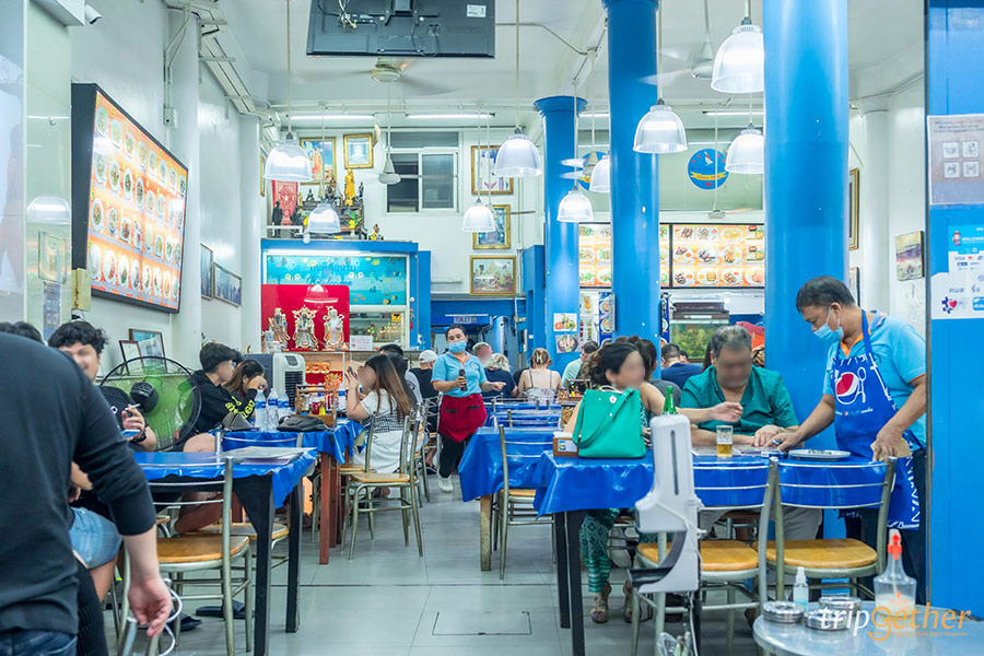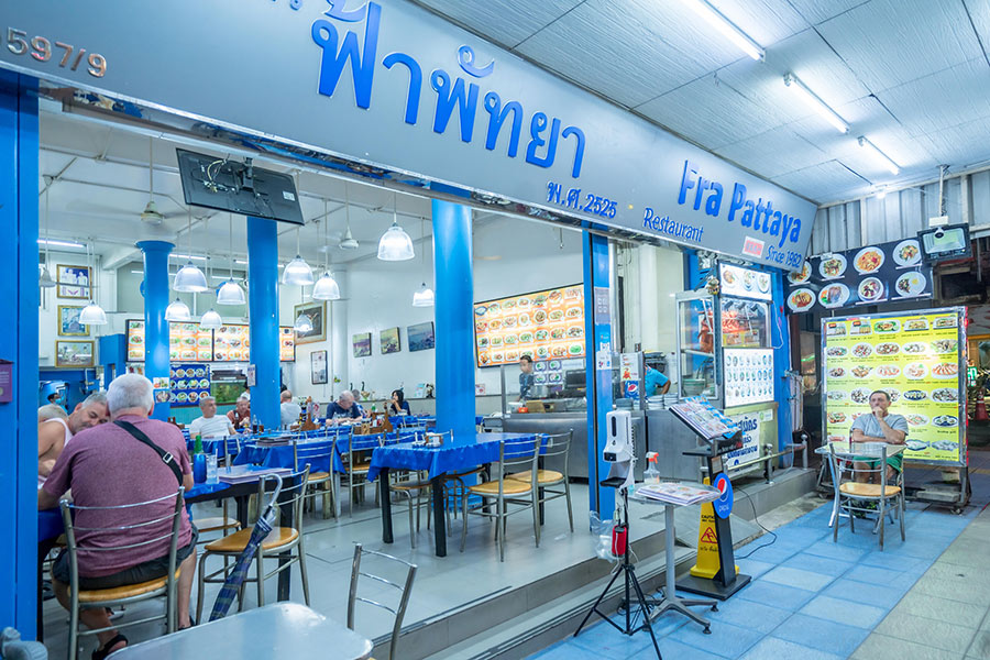 เปลี่ยนบรรยากาศมาลองร้าน local กันบ้างกับ ฟ้าพัทยา เป็นร้านตึกแถวอยู่ใกล้กับถนนคนเดินพัทยาหรือ walking street พัทยา บรรยากาศยามค่ำคืนของที่นี่ครึกครื้นมาก ทำให้บรรยากาศภายในของร้านก็ดูมีชีวิตชีวาไปด้วย มีทั้งนักท่องเที่ยวชาวไทยและชาวต่างชาติมากมาย ผลัดกันเดินเข้ามาในร้านตลอด เห็นแบบนี้เชื่อได้เลยว่าต้องเป็นร้านเด็ดแน่ๆ ส่วนเมนูที่มาแล้วล้วนต้องสั่งก็คือเมนูเป็ดทั้งหลาย ไม่ว่าจะเป็นเป็ดย่าง เป็ดล่อนทอดกรอบ แกงเผ็ดเป็ดย่าง ปากเป็ดทอด บอกเลยว่าใครชอบเป็ดเนื้อนุ่มๆ หนังกรอบๆ แนะนำร้านนี้เลย และนอกจากเมนูเป็ดทางร้านยังมีเมนูอาหารทะเลอื่นๆ อีกเยอะมาก ถ้าใครมาเดิน walking street พัทยาแล้วอยากอิ่มอร่อยแบบจัดเต็มห้ามพลาดร้านฟ้าพัทยาเด็ดขาด