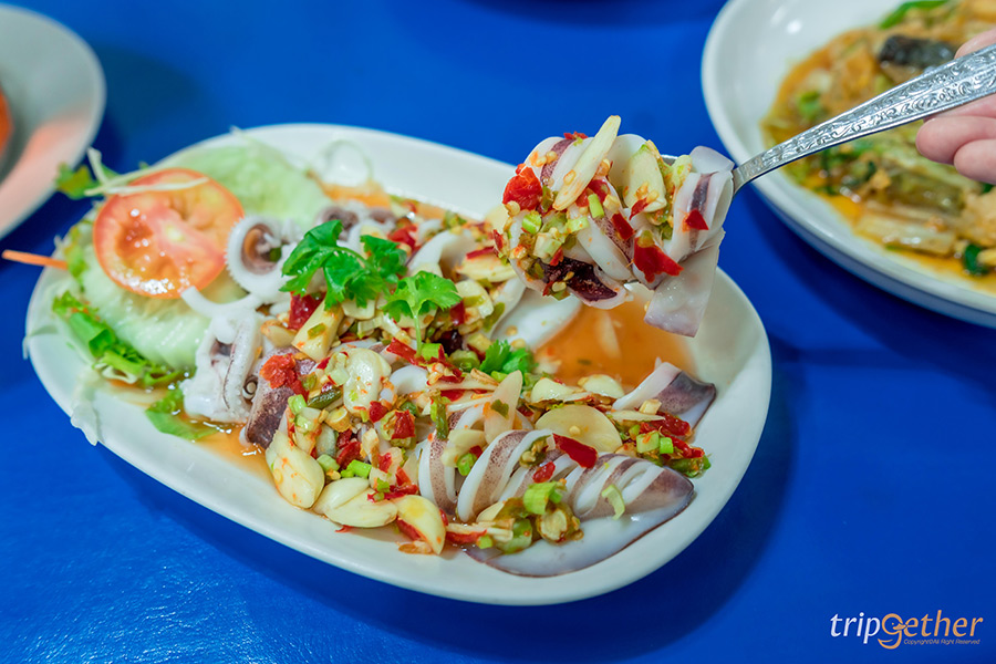 มาเริ่มกันที่ร้านแรกกับ ร้านศรีนวล ซีฟู้ด ร้านอาหารทะเลอร่อยเด็ดย่านบ้านอำเภอที่เสิร์ฟความอร่อยมากว่า 20 ปี บอกเลยว่าวิวดีมากแม่ บรรยากาศชิลล์ๆ ริมทะเลกินอาหารอร่อยๆ ดูพระอาทิตย์ลับขอบฟ้าสวยๆ ปังเวอร์ ส่วนภายในร้านศรีนวล ซีฟู้ด แบ่งออกเป็น 3 โซน คือโซนอินดอร์ โซนเอาท์ดอร์วิวทะเล และโซนคาเฟ่ ความพิเศษของร้านนี้คือมีทางเดินยื่นออกไปในทะเลด้วยนะ สามารถเดินไปชมวิว ถ่ายรูปสวยๆ ได้เลย ส่วนอาหารของทางร้านจะเป็นสไตล์กึ่งไทยจีน แต่ละเมนูใช้วัตถุดิบที่คัดมาแล้วอย่างดี สดๆ จากทะเลกันเลย มาดูเมนูแนะนำกันเลยดีกว่า เริ่มกันที่หมึกซาชิมิ ที่ทางร้านใช้หมึกหอมตัวใหญ่แบบสดๆ เนื้อหวานกรุบ จิ้มกับโชยุและวาซาบิแท้ คืออร่อยแบบแปลกใหม่ดีมาก มาต่อกันที่หนุมานคลุกฝุ่นเมนูหมึกที่ปังตั้งแต่ชื่อเมนู ซึ่งเมนูนี้ทางร้านจะเอาหมึกทั้งตัวผัดน้ำดำปรุงรสสูตรพิเศษของร้านรสชาติเข้มข้นเป็นอีกเมนูที่ไม่อยากให้ทุกคนพลาดเลย นอกจากนี้ยังมีเมนูแมงดาทะเลเผา ไข่แน่นๆ กินคู่กับน้ำยำ ทุกเมนูคือสดมาก มาที่นี่รับรองเลยว่าไม่ผิดหวังอิ่มอร่อยถูกใจแน่นอน