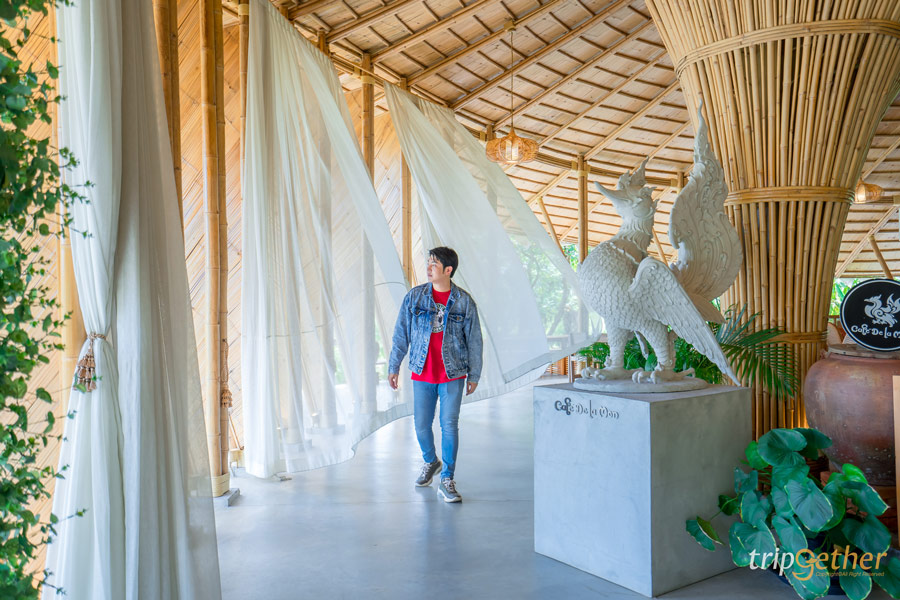 คาเฟ่เดอรามัญ ตั้งอยู่กลางทุ่งนา มีต้นไม้ล้อมรอบ ความเก๋ของที่นี่คือดีไซน์ร้านที่นำเอาวัสดุจากธรรมชาติ โดยหลักๆ เป็นไม้ไผ่ เพื่อสื่อถึงเอกลักษณ์ของชาวมอญที่ผสานกับความทันสมัยได้อย่างลงตัว ส่วนโซนที่นั่งจะเป็นแบบโอเพ่นแอร์ทั้งหมด มีที่นั่งให้เลือกเยอะ และยังมีโซนที่นั่งบาร์ชั้น 2 มองเห็นวิวได้ 360 องศา ต่อด้วยเมนูทางร้านมีทั้งอาหารไทยและนานาชาติ มาแล้วต้องลองอาหารไทยที่เป็นเมนูพื้นบ้านมอญ ไม่ว่าจะเป็น แกงบอน เดอ รามัญ แกงกล้วยไก่ ยำตำลึงกรอบปลายนา ห่อหมกทะเลมะพร้าวอ่อน ส่วนเมนูนานาชาติที่แนะนำก็จะมี พิซซ่าฮาวาเอียน สเต็กเนื้อวากิว ไส้กรอกเนื้อกวาง อิ่มของคาวจุกๆ ปิดท้ายด้วยของหวาน ที่มีทั้งเบเกอรี่และเครื่องดื่มมากมาย