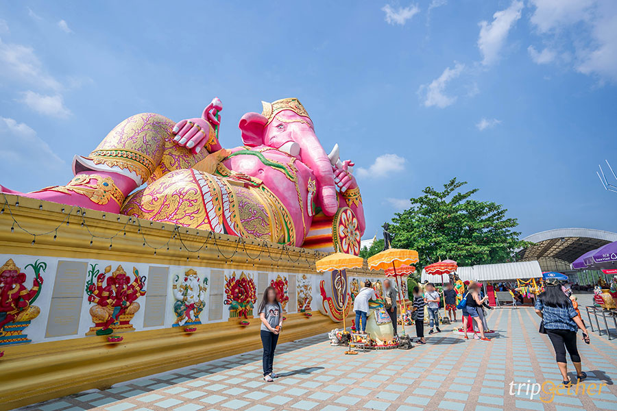 วัดสมานรัตนาราม วัดฉะเชิงเทราที่มีพื้นที่กว่า 26 ไร่ บนที่ตั้งริมแม่น้ำบางปะกง ตามหลักฮวงจุ้ยมงคลที่เรียกว่าถุงเงินถุงทอง โด่งดังจากการที่มี พระพิฆเนศปางนอนเสวยสุขผิวเนื้อเป็นสีชมพูองค์ใหญ่ที่สุดในประเทศไทย ปางที่เชื่อกันว่าจะประทานความสุขสบาย มีกินมีใช้ และขจัดปัดเป่าสิ่งไม่ดีออกไปจากชีวิต จึงทำให้ผู้คนมากมายมาขอพรจากพระพิฆเนศและกระซิบหนูเพื่อให้สำเร็จสมหวังดั่งใจนั่นเอง ไม่เท่านั้นบริเวณวัดยังมีพระพิฆเนศปางปาฏิหาริย์ 108 กร, พระโพธิสัตว์กวนอิม ปางประทานบุตรและโชคลาภ, พระอินทร์ทรงช้างเอราวัณ, พระราหู, ท้าวมหาพรหม, หลวงพ่อโต พระประธารอุโบสถหลังใหม่, หลวงพ่อองค์ดำ, หลวงพ่อประธารพร, จระเข้โหราเทพารักษ์ และดอกบัวกลางน้ำที่ประดิษฐานของพระบรมสารีริกธาตุให้สักการะกันด้วย