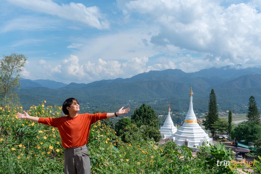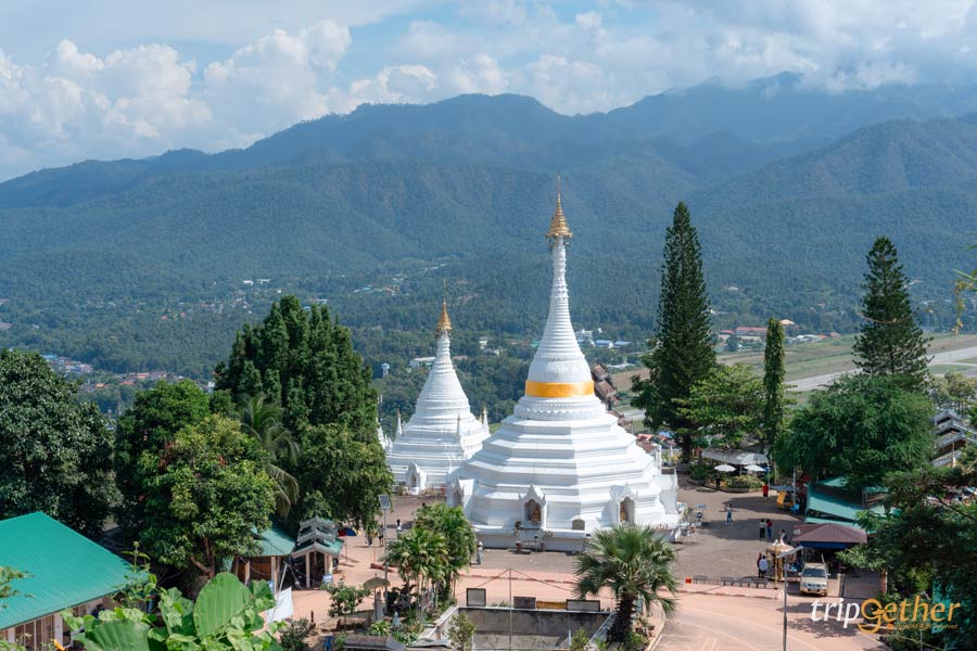 เปิดแมพไป วัดสวยบนเขา พิกัดแรกกันเลย กับ วัดพระธาตุดอยกองมู สถานที่เก่าแก่เมืองแม่ฮ่องสอน ตั้งอยู่บนยอดเขาสูง ซึ่งการเดินทางมายังวัดแห่งนี้สามารถเดินทางได้โดยใช้เวลาไม่นาน รวมทั้งเส้นทางไม่ได้ลาดชันและสูงมากนัก ความโดดเด่นของวัดพระธาตุดอยกองมูคือมี เจดีย์สีขาวศิลปะแบบพม่า 2 องค์ ตั้งอยู่ข้างกัน ซึ่งเจดีย์องค์ใหญ่ภายในเป็นที่ประดิษฐานของ พระธาตุพระโมคคัลลานะ ที่อัญเชิญมาจากเมืองมัณฑะเลย์ ประเทศพม่า ส่วนองค์เล็กที่ตั้งอยู่ด้านหน้า สร้างขึ้นโดยเจ้าเมืองแม่ฮ่องสอนคนแรก โดยรอบฐานเจดีย์จะมีบุษบกศิลปะพม่าประจำอยู่ทั้ง 4 ทิศ และอีกหนึ่งไฮไลท์ของวัดนี้ก็คือ วิวภูเขาที่ห้อมล้อมอยู่ไกลๆ รวมทั้งวิวตัวเมืองแม่ฮ่องสอนด้านล่างอีกด้วย