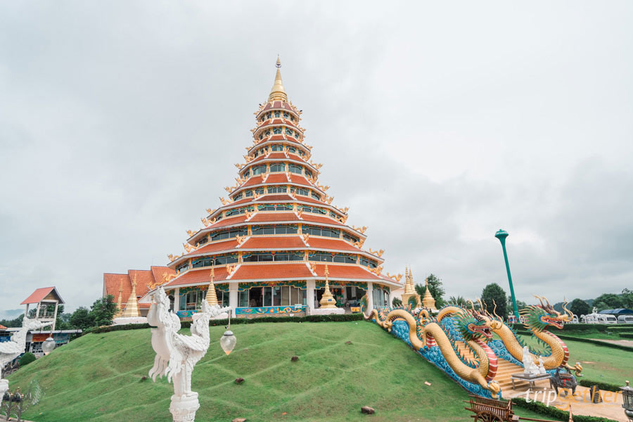 ปิดท้าย วัดสวยบนเขา เส้นทางสายบุญกันที่ วัดห้วยปลากั้ง ตัววัดตั้งอยู่บนเนินเขารายล้อมด้วยทิวทัศน์ที่เขียวขจีงดงามมาก สามารถมองเห็นได้อย่างสวยเด่นจากระยะไกล ด้วยองค์เจ้าแม่กวนอิมแกะสลักจากไม้จันทร์หอมสีขาวองค์ใหญ่ นอกจากนี้ยังมี พบโชคธรรมเจดีย์ อาคารรูปเจดีย์ขนาดใหญ่สูง 9 ชั้น และมีมังกรด้านหน้าทอดยาวขึ้นไปตลอดทางขึ้น เป็นศิลปะจีนผสมล้านนา ที่นี่ใช้เวลาในการก่อสร้างถึง 999 วัน บอกเลยว่าสวยอลังการงานสร้างสุดๆ เป็นอีกวัดหนึ่งที่มีสถาปัตยกรรม ความวิจิตรงดงาม ไม่แพ้วัดอื่นๆที่อยู่ในจังหวัดเชียงรายเลย