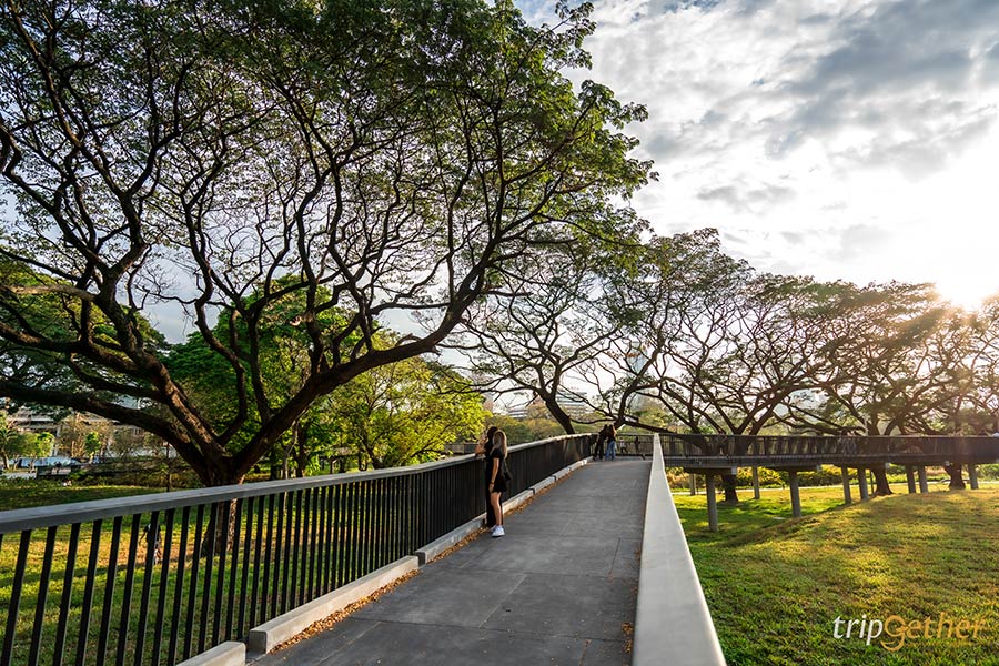 ถ้านึกถึงสถานที่ท่องเที่ยวฟีลญี่ปุ่นจะพลาด สะพานเขียว ที่สวนลุมพินีไปได้อย่างไร สะพานลอยฟ้าแห่งแรกๆ ของกรุงเทพฯ ที่มีทางวิ่งและทางปั่นจักรยานลอยฟ้าที่เชื่อมจากสวนลุมพินีถึงสวนเบญจกิติ และอีกหนึ่งเสน่ห์ที่ไม่ว่าใครที่มาก็บอกเป็นเสียงเดียวกันว่าบรรยากาศบนสะพานนี้เหมือนญี่ปุ่นสุดๆ แนะนำให้มาช่วงเย็นๆ บอกเลยว่าสายถ่ายรูปต้องหลงรักเพราะแสงสวยมาก หรือใครอยากเปลี่ยนบรรยากาศออกกำลังกายสะพานเขียวก็เหมาะสุดๆ ถ้าทำกิจกรรมต่างๆ กันจนเหนื่อยแล้วก็มีร้านขายน้ำ ขายขนมให้เติมพลังกันอีกด้วย ลองจับมือหวานใจไปเดินชมบรรยากาศตอนเย็นๆ ที่สะพานเขียว ผลัดกันถ่ายรูป หรือจะชวนกันมาออกกำลังกายแค่คิดก็โรแมนติกสุดๆ แล้ว