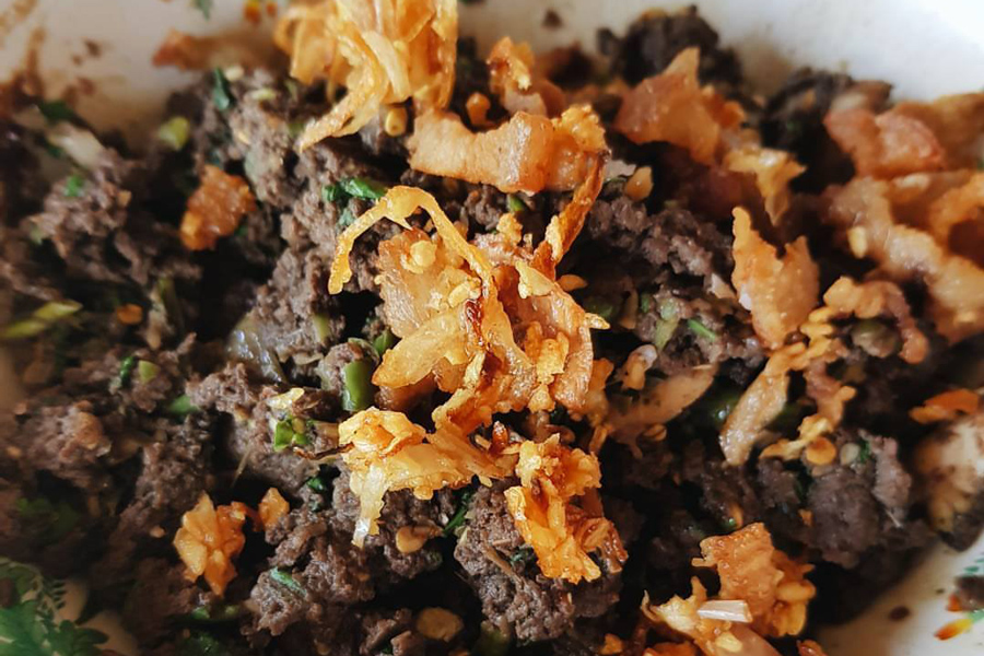 อาหารพื้นเมืองที่หากินไม่ยากแต่ก็ไม่ง่าย ทำจากมันปูนาและไข่แดงที่นำไปตีให้เข้ากันแล้วปรุงรสนำไปปิ้งไฟอ่อนๆให้สุก แค่ทานกับข้าวสวยร้อนๆก็ฟินแล้ว