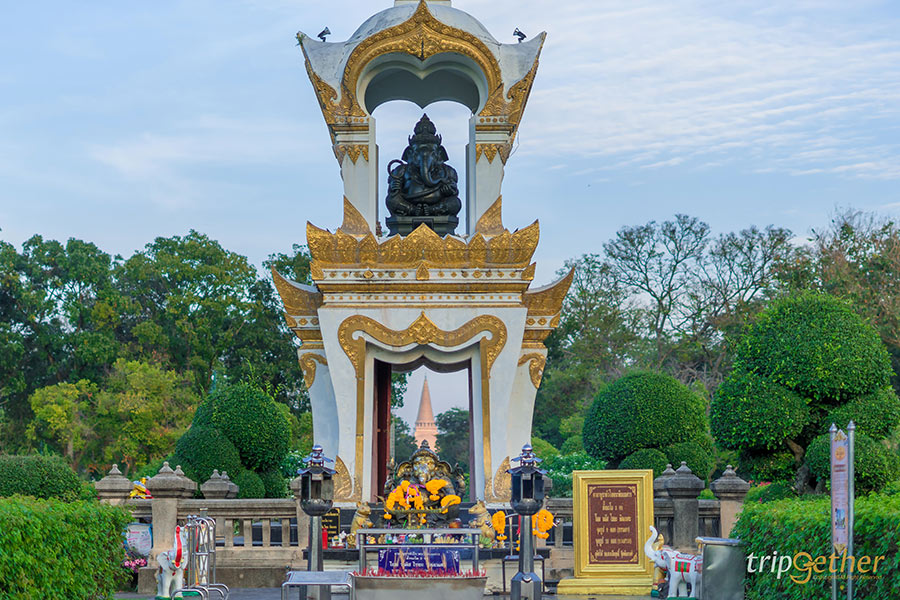 เดินทางออกจากกรุงเทพฯ ไปต่อที่นครปฐม เทวาลัยคเณศร์ พระราชวังสนามจันทร์ องค์พระพิฆเนศเนื้อสำริดตั้งอยู่ในพระราชวังสนามจันทร์ ซึ่งรัชกาลที่ 6 ทรงโปรดเกล้าฯ ให้สร้างขึ้น และถ้าสังเกตดีๆ จะสามารถมองเห็นยอดขององค์พระปฐมเจดีย์ผ่านทางช่องของฐานพระพิฆเนศได้ด้วย สำหรับใครที่อยากมาสักการะขอพรองค์พระพิฆเนศที่เทวาลัยคเณศร์ พระราชวังสนามจันทร์ จะต้องเช็คเวลากันหน่อยเพราะทางพระราชวังสนามจันทร์เปิดให้เข้าเป็นช่วงเวลาวันละสองรอบ และสำหรับผู้หญิงจะต้องแต่งกายเรียบร้อยนิดนึง ส่วนของที่จะนำมาสักการะจะต้องเตรียมมาเอง ใครที่อยากประสบความเร็จในหน้าที่การงานก็แวะมาที่นี่กันได้