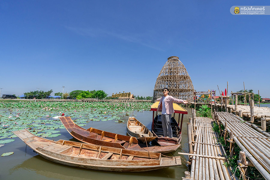 ตลาดน้ำสะพานโค้ง อีกหนึ่งจุดเช็คอินฮิตของจังหวัดสุพรรณบุรี เป็นตลาดน้ำสะพานไม้ไผ่ที่ทอดยาวอยู่ท่ามกลางทุ่งดอกบัวหลวงบนคลองสองพี่น้อง ในสองฟากฝั่งสะพานเต็มไปด้วยร้านค้าขายสินค้ามากมายทั้ง อาหารคาวและหวาน ผลไม้ ผักสดสวนครัว ที่ชาวบ้านนำมาวางขายกันอย่างเนืองแน่น ทั้งยังจัดเต็มไปด้วยมุมถ่ายรูปสุดปังให้แวะเซลฟี่กันได้ตลอดวัน ทั้งมุมศาลา ซุ้มไม้ไผ่ เรือโบราณ และพลาดไม่ได้กับมุมไฮไลท์เด็ดอย่าง “สุ่มปลายักษ์” ที่สร้างจากไม้ไผ่กว่า 1,000 ต้น ภายในถูกจักแบ่งเป็นชั้นให้สามารถเข้าไปนั่งกินลมชมวิวได้ บริเวณด้านบนยังเป็นดาดฟ้าที่สามารถชมวิวได้ 360 องศา เรียกได้ว่าเป็นจุดเช็คอินที่ชิคสุดๆ