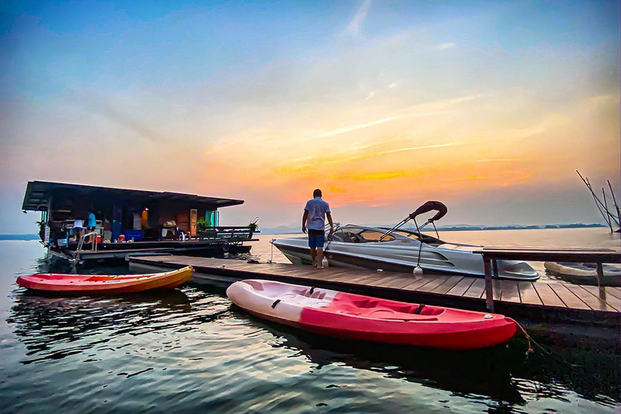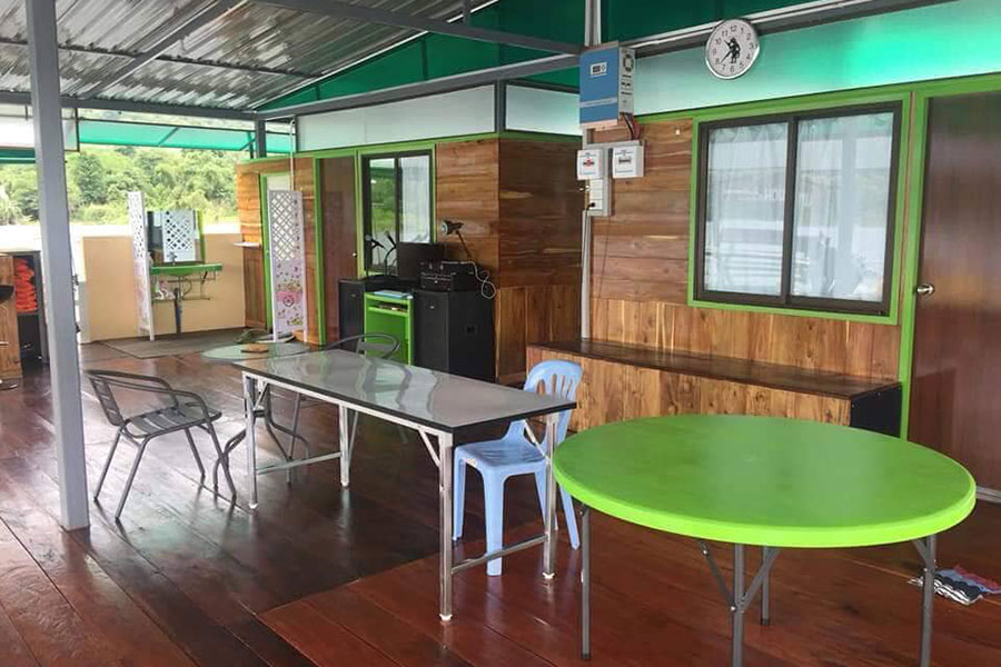 พักผ่อนบนแพสบายๆ พร้อมจัดปาร์ตี้สนุกๆ ด้วยชุดคาราโอเกะจัดเต็มด้วยลำโพงให้สนุกได้ยกแก๊งค์ บนแพตกแต่งเรียบง่ายเน้นงานไม้ มาพร้อมเครื่องเล่นทางน้ำและกิจกรรมมากมายทั้ง พายเรือคายัค เรือถีบ ห่วงยาง แฟนตาซี และอีกหลากหลายกิจกรรม สำหรับใครที่อยากพักผ่อนมองวิวสบายๆ ก็มีมุมที่นั่งริมแพให้นั่งพักผ่อนเงียบๆ ได้อีกด้วย ใครที่เป็นสายปิ้งย่างที่นี่ก็มีบริการเตาปิ้งย่างให้ฟรี เพียงเตรียมวัตถุดิบมารังสรรค์เองได้เลย ไม่ว่าจะมาเป็นกลุ่มเล็ก กลุ่มใหญ่ที่นี่ก็รองรับได้หมดสะดวกสบายจริงๆ