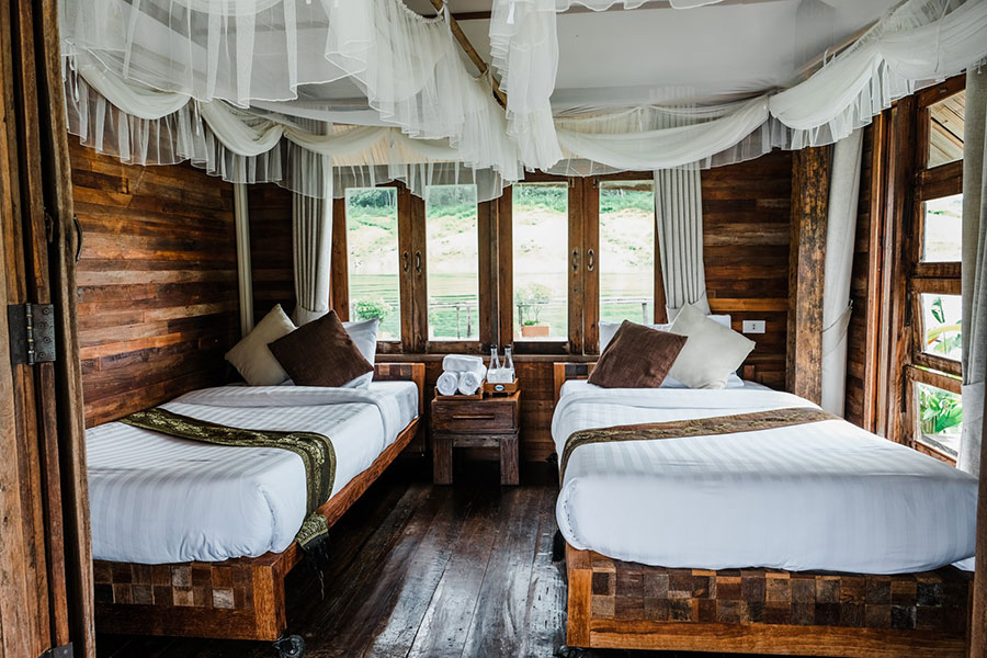 Price: บ้านแพ ราคาเริ่มต้น 2,035 – 2,960 บาท/คืน/ราคารวมอาหารเช้าและอาหารเย็น (ถ้าไม่ต้องการอาหารเย็นลดราคาห้องละ 400 บาท)