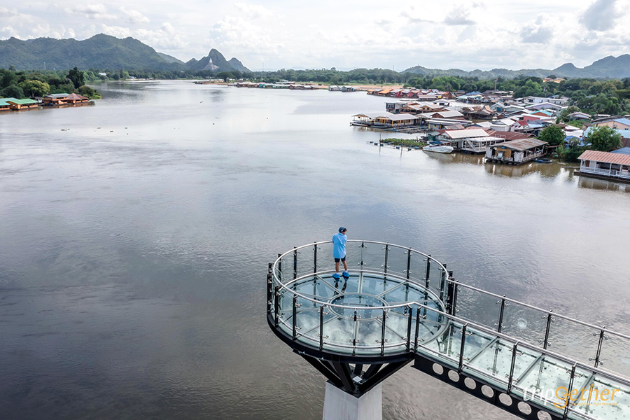 สกายวอล์คสองแคว – แม่กลอง แลนด์มาร์คแห่งใหม่ของกาญจนบุรีที่บอกเลยว่าสายเช็คอินห้ามพลาด ตัวสกายวอล์คเป็นกระจกใสตั้งอยู่ริมแม่น้ำแควใหญ่ และด้วยความยาวกว่า 150 เมตรทำให้สามารถเดินชมวิวได้เพลินๆ แถมถ่ายรูปมาก็ดูดีมาก ได้รูปฉากหลังเป็นแนวเขาโอบล้อมเมืองกาญจน์และเห็นวิวแม่น้ำสองสายหลักทั้งแม่น้ำแควน้อยและแควใหญ่ไหลรวมบรรจบกันเป็นแม่น้ำแม่กลอง เป็นที่เที่ยวถ่ายรูปสวยเปิดใหม่ที่สายโซเชียลต้องมาแล้ว