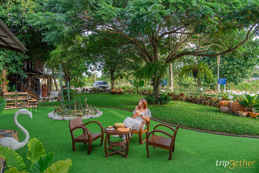 กาแฟในสวน คาเฟ่ปทุมธานีที่มาในสไตล์บ้านสวน ตัวร้านเป็นร้านไม้เล็กๆ น่ารักที่ซ่อนอยู่ใต้ความร่มรื่นของเงาไม้ บรรยากาศชิลล์ๆ และเงียบสงบ เหมาะกับคนที่ต้องการหนีความวุ่นวายในกรุงเทพฯ มาพักผ่อนสบายๆ ในวันหยุด แม้ว่าในร้านจะเล็กแต่นอกร้านมีมุมให้ได้นั่งเพียบ โดยโซนนั่งที่ร้านจะเป็นแบบโอเพ่นแอร์ เน้นรับลมธรรมชาติ เริ่มจากโซนแรกนั่งชิลล์กลางสวน มองวิวความเขียวขจีของต้นไม้ต่างๆ หรือจะมานั่งริมสระน้ำก็เย็นสบายไม่แพ้กัน เป็นร้านที่สามารถนั่งได้ยาวๆ และใครมาก็อย่าลืมสั่งเมนูฮิต อย่างฮันนี่โทสต์ ข้าวเหนียวมะม่วงที่เสิร์ฟมาคู่กับไอศกรีมโฮมเมดมะม่วง นอกจากของหวานทางร้านก็มีเสิร์ฟอาหารมังสวิรัติด้วย เรียกได้ว่ากินอาหารคาวแล้วต่อด้วยหวานได้เลย