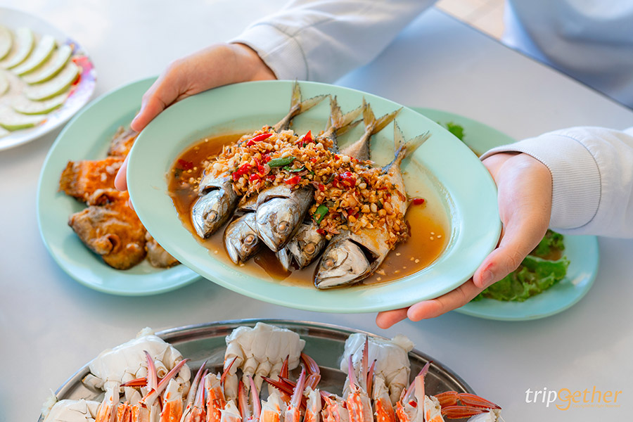 ครัวครูหมู ร้านอาหารริมน้ำแม่กลองกับความอร่อยกว่า 20 ปี และที่สำคัญวิวร้านนี้ก็ไม่ธรรมดา สามารถเห็นวิวแม่น้ำและเห็นสะพานพระพุทธเลิศหล้าได้แบบเต็มๆ ส่วนที่นั่งมีให้เลือกเยอะมาก เป็นแบบโอเพ่นแอร์และมีทั้งหมด 2 โซน คือโซนด้านในและโซนริมน้ำ ถ้ามาช่วงเย็นๆ แนะนำโซนริมน้ำ ลมเย็นสบายมาก สำหรับเมนูทางร้านก็เด็ดไม่แพ้บรรยากาศ เน้นอาหารทะเลแบบสดๆ ไม่ว่าจะเป็นกุ้ง ปู หมึก ปลาทู ปลากะพง ปลาเก๋า หอยเชลล์ มีครบทั้งนึ่ง ทอด ต้ม ผัด ยำ เรียกได้ว่าใครอยากกินแบบไหนทางร้านก็พร้อมจัดให้ แต่เมนูที่มาแล้วห้ามพลาดก็คือ ปูทะเลดอง เนื้อแน่น รสเค็มหวานลงตัว ราดด้วยน้ำจิ้มซีฟู้ด ความอร่อยเอาไปเต็มสิบ ต่อด้วยแกงร้อนๆ อย่าง แกงส้มไข่ปลาริวกิว รสจัดจ้านถึงเครื่อง ได้ไข่ปลามาชิ้นโตๆ เป็นอีกเมนูที่ต้องมีติดทุกโต๊ะ และแน่นอนว่ามาถึงแม่กลองก็ต้องจัด ปลาทูทอดน้ำปลา ตัวใหญ่เนื้อแน่น หอมกลิ่นนำ้ปลาอ่อนๆ อยากให้ทุกคนลองมาลิ้มรสด้วยตัวเองสักครั้ง เตรียมปักหมุดมาที่ครัวครูหมู ร้านอาหารแม่กลอง สมุทรสงครามกันเลย