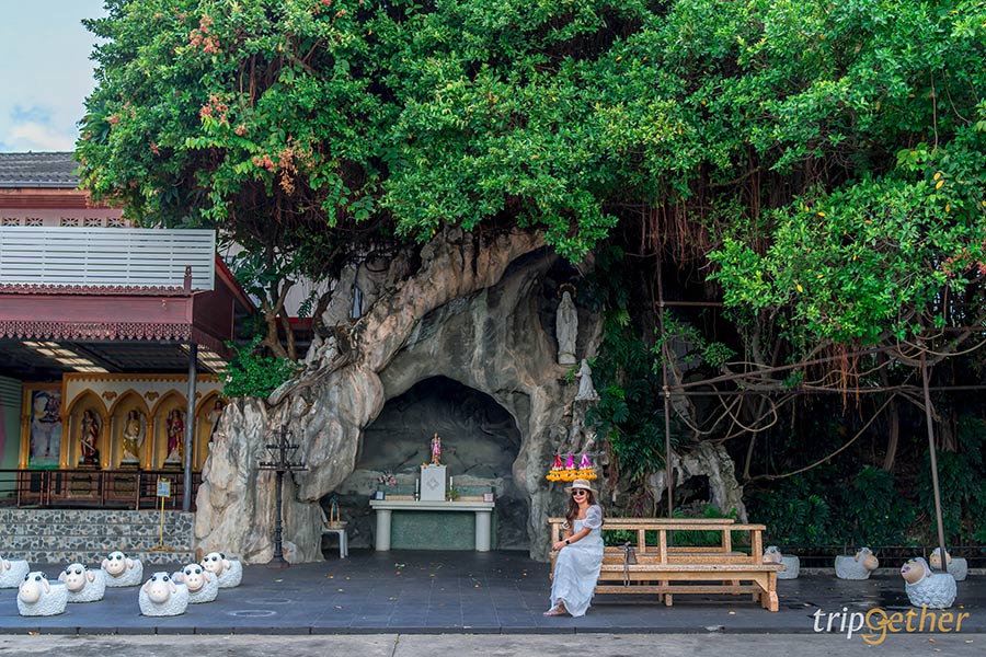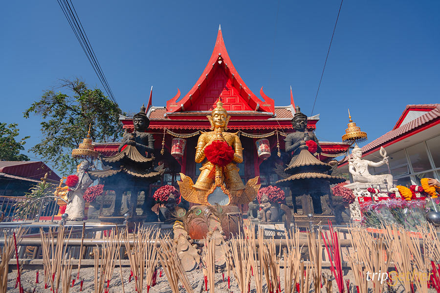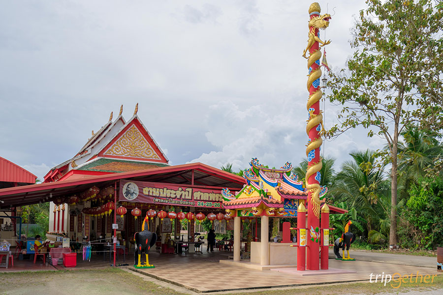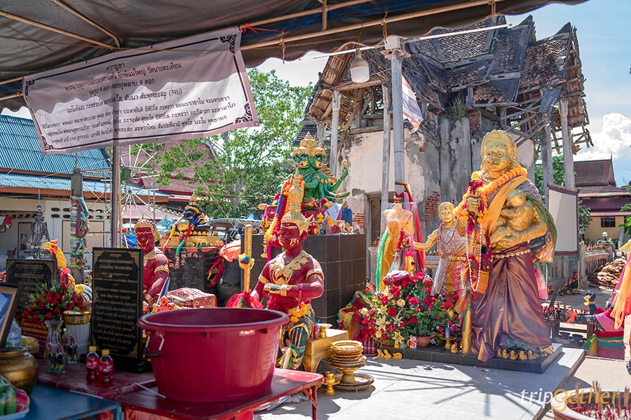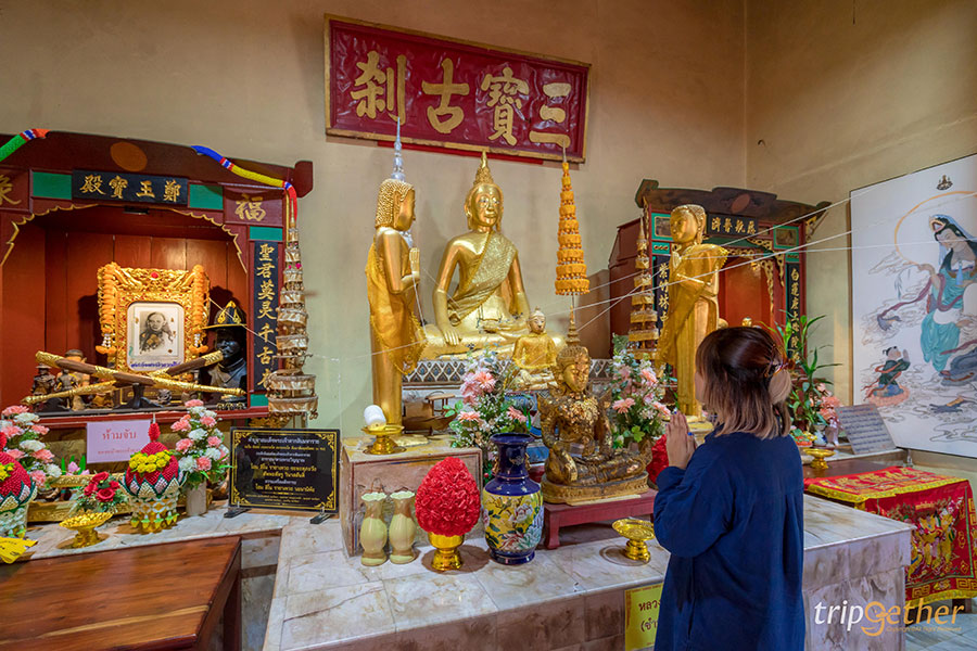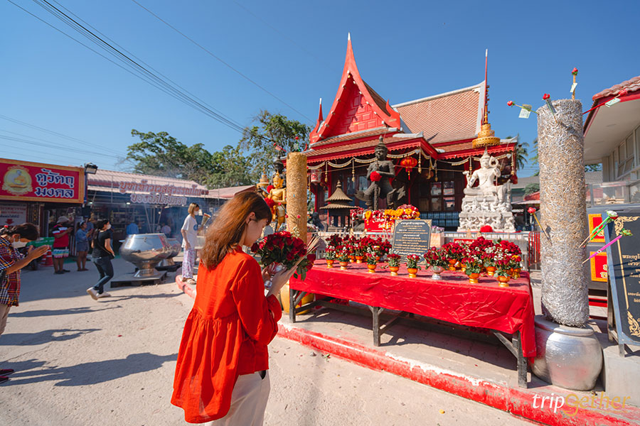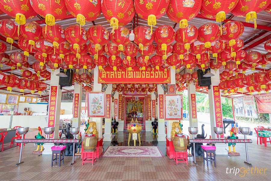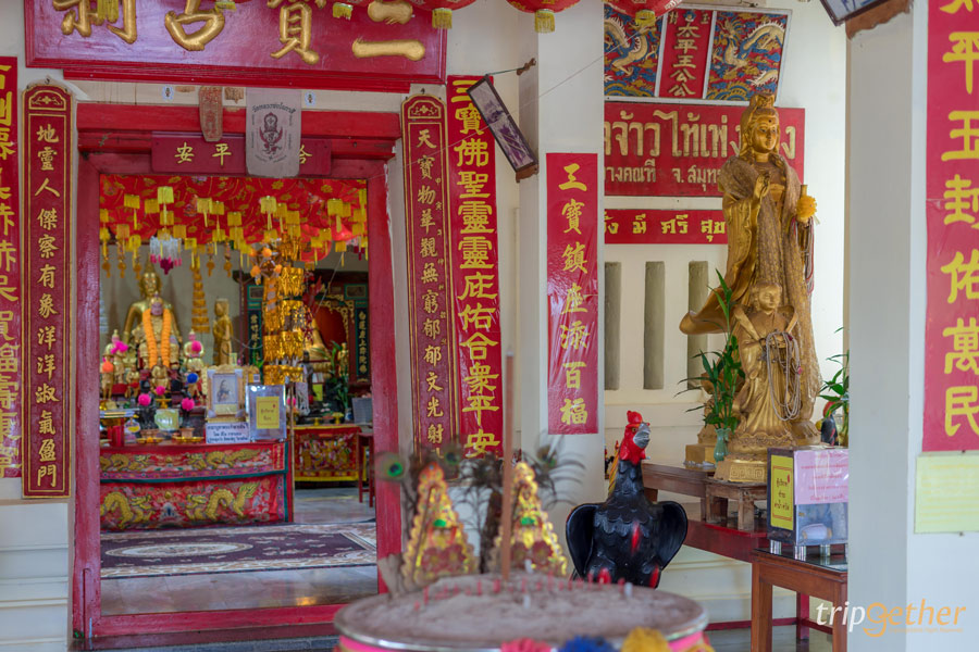 ศาลเจ้าไทเพ่งอ้วง ศาลเจ้าจีนริมแม่น้ำแม่กลอง เมื่อมาถึงแล้วเราจะพบกับจุดให้ได้กราบขอพรเยอะมาก เร่ิมจากจุดแรกจะต้องมาไหว้ หลวงพ่อโตหรือซำปอกง ซึ่งเป็นพระประธานในศาลเจ้า ต่อด้วยไหว้ด้านซ้ายที่เป็นพระบรมรูปสมเด็จพระเจ้ากรุงธนบุรี สามารถขอพรด้านการค้า ธุรกิจรุ่งเรือง และต่อด้วยด้านขวาที่เป็นองค์เทพเจ้าไท้เพ่งอ๊วงกง สามารถขอพรเรื่องความร่มเย็นสงบสุขได้ หลังจากกราบไหว้ตามนี้แล้วก็สามารถมาขอพรกับสิ่งศักดิ์สิทธิ์ต่อได้ ไม่ว่าจะเป็นองค์เจ้าพ่อเสือ เสาหลักเมือง พระเจ้าตากสินมหาราช พระแม่กวนอิม พระอรหันต์ หลวงพ่อโต