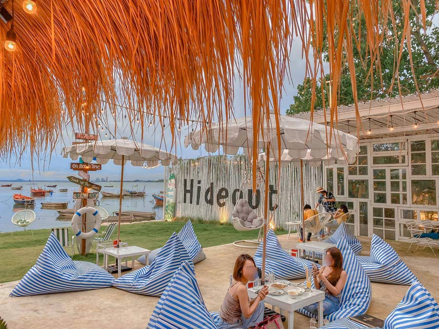 Hideout Beach Cafe & Bistro ร้านริมทะเลกับบรรยากาศน่ารักๆ เหมาะกับการหนีความวุ่นวายมานั่งชิลล์รับลมทะเลที่นี่ ส่วนตัวร้านที่ออกแบบมาสอดคล้องไปกับกลิ่นอายของท้องทะเล ให้ฟีลเหมือนอยู่ฮาวาย รวมถึงมุมถ่ายรูปในร้านก็มีหลายจุด สามารถแชะภาพเช็คอินกันได้รัวๆ สำหรับที่นั่งมีเยอะมากทั้งในร่ม ในห้องแอร์ และบนหาดทราย และมาถึงที่นี่แล้วก็ห้ามพลาดสั่งเมนูซีฟู้ดสดๆ ทั้งซาชิมิ ปลานึ่งซีอิ๊ว ปลาทอดราดน้ำปลา ผัดฉ่า นอกจากนี้ยังมีอาหารไทยและอิตาเลียนด้วย จบคาวแล้วก็มาต่อของหวาน ที่ร้านมีทั้งเค้ก เบเกอรี่ และเครื่องดื่มสดชื่นมากมาย บอกเลยว่าเป็นร้านลับของศรีราชาที่ไม่ธรรมดาจนต้องมาเช็คอินจริงๆ