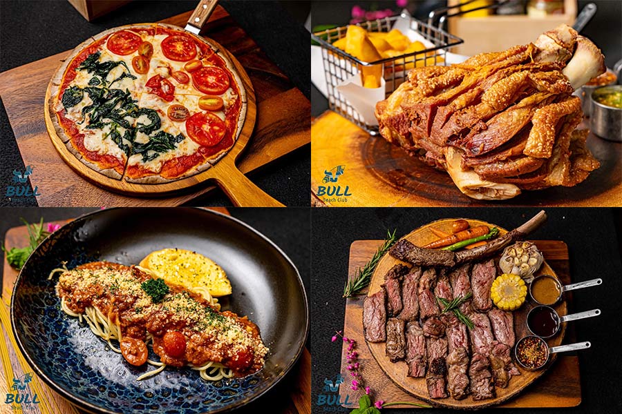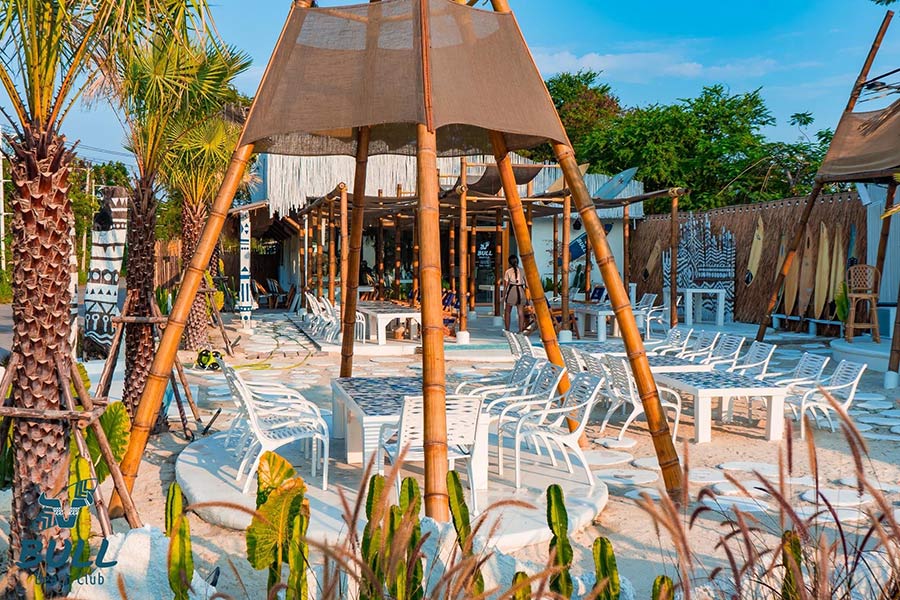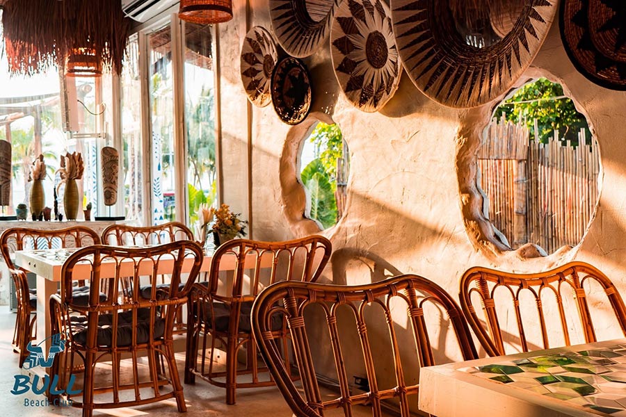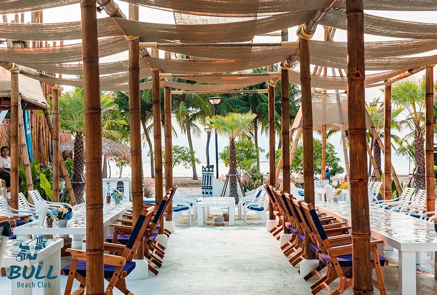 Bull Beach Club ร้านริมทะเล ชลบุรีบนหาดกระทิงลาย ตัวร้านตกแต่งสไตล์บาหลีชนเผ่า ตลอดทั้งร้านมาในมู้ดและโทนเดียวกัน โดยจะเน้นสีน้ำตาล ขาว บวกกับการตกแต่งที่ไปในทางเดียวกัน บอกเลยว่าถ่ายรูปมาสวยคุมโทนสุดๆ สำหรับที่นั่งในร้านมีให้เลือกทั้งแบบอินดอร์ห้องแอร์เย็นๆ และโซนเอาท์ดอร์ รับลมทะเลกันแบบสบายๆ และยิ่งมาช่วงเย็นจะได้แสงที่สวยมาก รวมถึงเห็นพระอาทิตย์ตกดินได้จากในร้าน เมนูอาหารจะเป็นอิตาเลียนฟิวชั่น มีเครื่องดื่มทั้งผลไม้ ชา กาแฟ หรือจะสายแอลก็มีไวน์ ค็อกเทลให้ได้จิบเพลินๆ เหมือนกัน