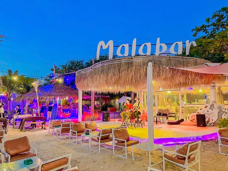 Malabar Beach บรรยากาศสุดชิลล์ติดทะเลบางแสน ตัวร้านอยู่บนชายหาดส่วนตัว มีความเงียบสงบและเป็นส่วนตัว โซนที่นั่งมีให้เลือกหลายแบบ ถ้ามาช่วงกลางวันหรือบ่ายแล้วกลัวร้อนก็สามารถเลือกนั่งอินดอร์ห้องแอร์ได้เลย แต่ถ้ามาช่วงเย็นๆ ที่อากาศเริ่มสบายๆ ก็ต้องนั่งเอาท์ดอร์บนหาด เป็นที่นั่งแบบเปิดโล่ง ไม่มีอะไรมากั้น สามารถรับลมและเห็นวิวทะเลแบบเต็มๆ ส่วนเมนูอาหารก็อิ่มกันแบบจุกๆ มีครบทั้งคาว ขนมหวาน และเครื่องดื่ม นอกจากนี้ยังมีดนตรีสด ดีเจ และโชว์กระบอกไฟด้วยนะ เรียกได้ว่าเป็นร้านริมทะเล ชลบุรีที่น่าไปชิลล์เอาท์มาก