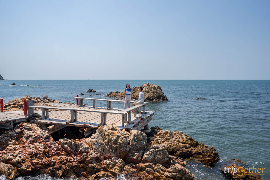 หากเราเดินทางมาที่จุดชมวิวเจดีย์บ้านหัวแหลม ก็จะพบกับภาพของเจดีย์สีขาวอายุนับสองร้อยปีที่ตั้งอยู่บนโขดหินกลางน้ำเป็นที่ยึดเหนี่ยวจิตใจของชาวประมงเมืองจันท์ สะพานไม้เล็กๆ ที่เป็นเส้นทางเดินมายังจุดชมวิว สามารถเก็บเป็นมุมถ่ายรูปสวยๆ ได้ หรือยังสามารถนั่งห้อยขาฟังเสียงคลื่นสบายๆ ได้อีกด้วย แล้วถ้ายิ่งมาช่วงเช้าที่ตะวันขึ้นและช่วงเย็นที่ฟ้าเป็นสีพาสเทล บอกเลยว่าสวยสุดๆ