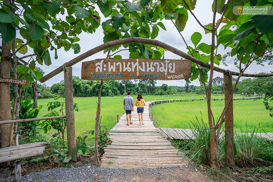 หนีฝุ่นมาเที่ยวใกล้ๆ กรุงเทพอย่าง สะพานทุ่งนามุ้ย บนพื้นที่กว่า 15 ไร่มาพร้อมสะพานไม้ยาวกว่า 150 เมตร เมื่อจอดรถและเดินเข้ามาก็จะมีจุดให้หยอดเงินคนละ 10 บาทเป็นการบริจาคเพื่อช่วยซ่อมแซมสะพานไม้เพื่อเปลี่ยนไม้ให้เพื่อนๆ ได้มาเที่ยวถ่ายรูปกันได้ตลอด ที่มาของชื่อสะพานทุ่งนามุ้ยคือ แต่ก่อนนี้ที่สะพานทุ่งนามุ้ยแห่งนี้เป็นป่าหมามุ่ยแต่คนพวนเรียกเพี้ยนจนกลายเป็นคำว่า มุ้ย จึงเรียกติดปากจนมาจนถึงปัจจุบัน และกว่าจะมาเป็นแลนด์มาร์กแบบนี้ได้เกิดจากการสร้างเพื่ออำนวยความสะดวกในการทำการเกษตรเพื่อช่วยผ่อนแรงในการทำนา ซึ่งนาที่นี่จะปลูกปีละ 2 รอบด้วยกันในช่วงเดือนสิงหาคมแบบนี้ก็จะสามารถชมความเขียวขจีของทุ่งนาได้แบบฟินสุด ซึ่งภายในทุ่งนามุ้ยแห่งนี้ก็มีร้านกาแฟเล็กๆ พร้อมพื้นที่ให้นั่งสบายๆ นอกจากการเดินถ่ายรูปที่สะพานไม้อีกด้วย