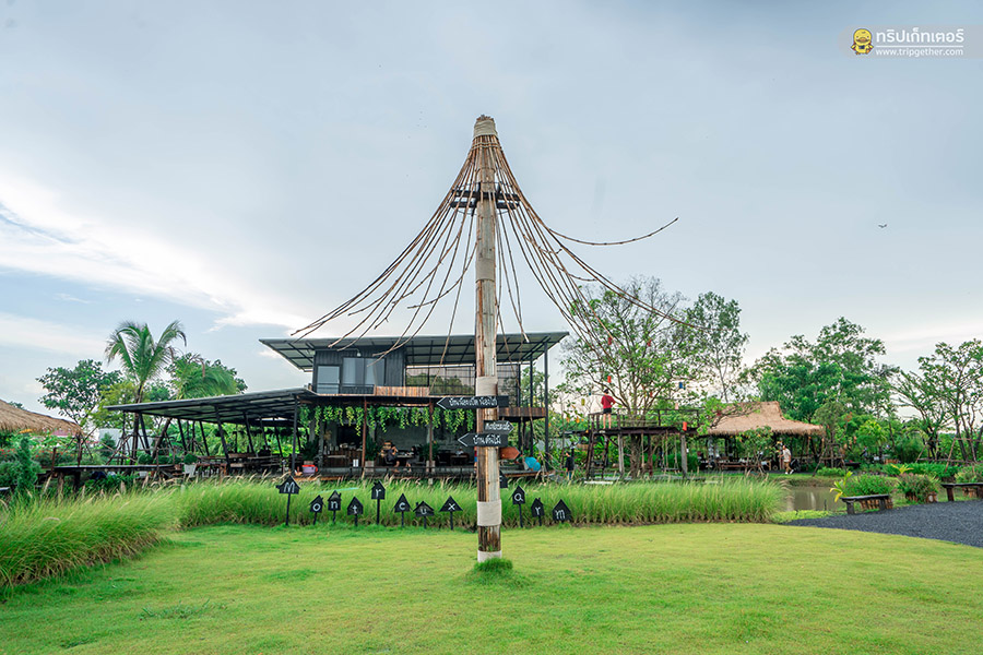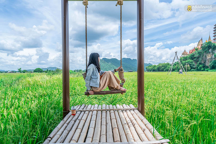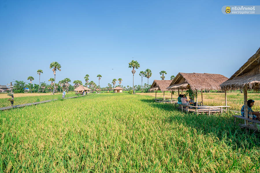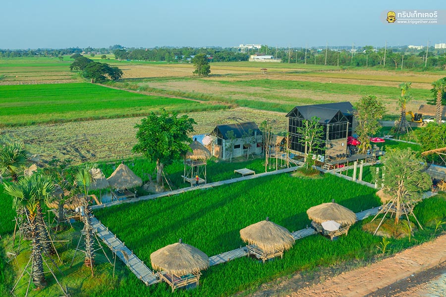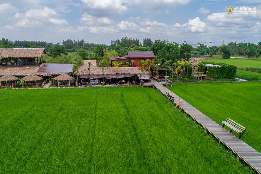 นาข้าวคาเฟ่ คาเฟ่สุดเขียวขจีด้วยการตกแต่งร้านสไตล์ลอฟท์ตัดกันได้อย่างลงตัวโดดเด่นอยู่กลางท้องทุ่ง ภายในเน้นความโปร่งโล่งด้วยหลังคาทรงสูงมาพร้อมผนังบล็อกปูนเปลือยเท่ๆ ติดกระจกบานใหญ่รอบร้านให้แสงจากด้านนอกส่องเข้ามาภายในร้านทำให้ร้านดูสว่างขึ้น ในส่วนโซนเอ้าท์ดอร์ของร้านเป็นซุ้มเถียงนาให้นั่งเรียบรายกันสามารถมองเห็นวิวสวยได้ไม่ต่างกัน เมนูอาหารของร้านมีให้เลือกรับประทานเพียบทั้งอาหารจานเดียว เครื่องดื่มเติมความสดชื่น และเบเกอรี่หวานอร่อย นอกจากนี้ยังมีไฮไลท์เด็ดของร้านที่จะมาเปลี่ยนวันพักผ่อนของคุณให้กิ๊บเก๋ด้วยการออกไปเดินถ่ายรูปกับสะพานไม้ที่ทอดยาวอยู่บนท้องทุ่งสีเขียวสุดชิลล์ ที่นี่ยังมีมุมถ่ายรูปอีกเพียบให้เลือกทั้งชิงช้า หอคอย และอีกหลากหลายมุมสวยถูกใจสาวๆ แน่นอน