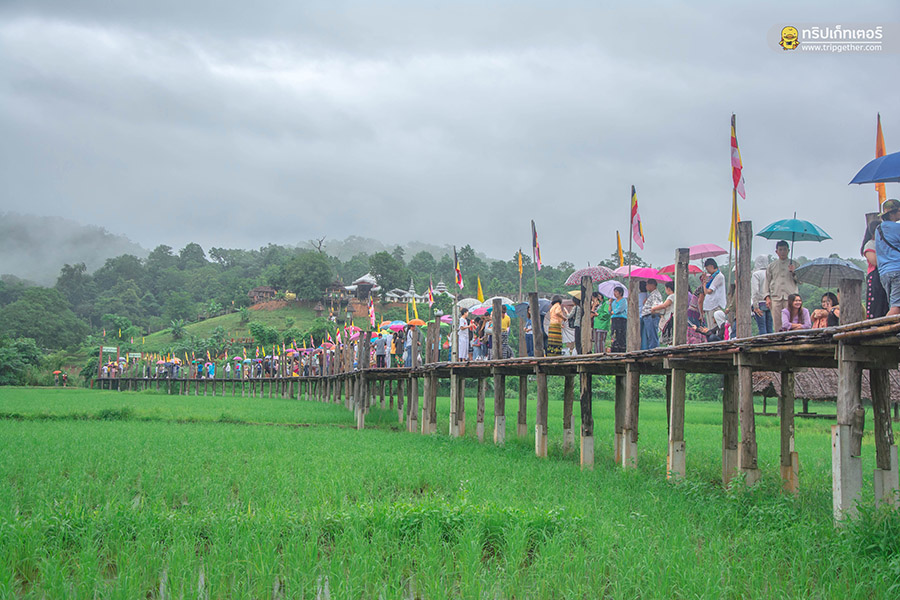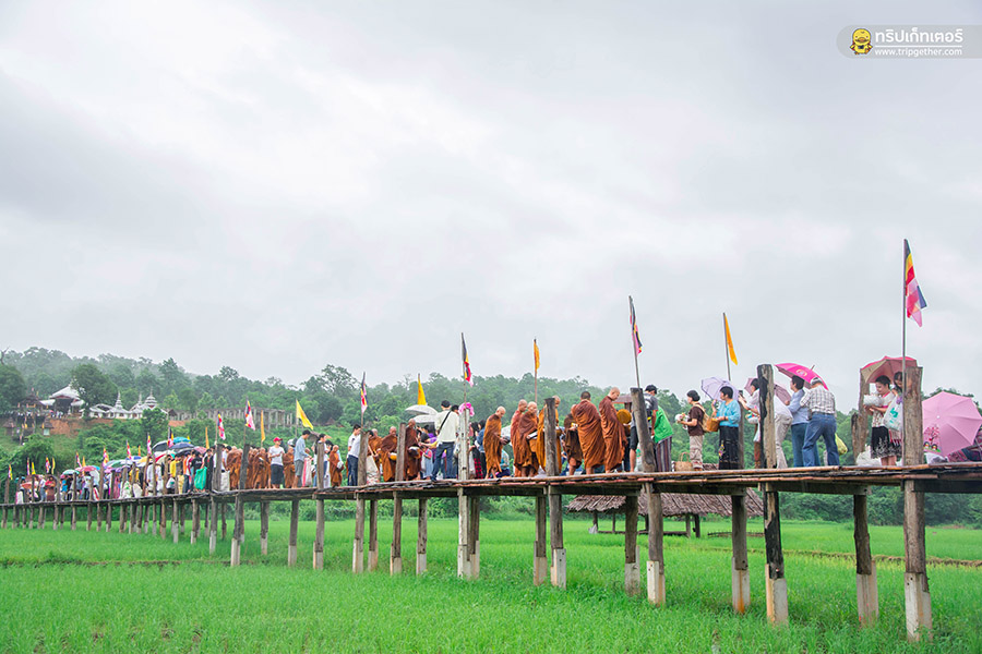 สะพานแห่งบุญที่ใช้คำว่า ซูตองเป้ ที่เป็นภาษาไทยใหญ่มีความหมายว่า “อธิษฐานสำเร็จ” ซึ่งมีความเชื่อว่าหากมายืนอยู่ตรงกลางสะพานแล้วอธิษฐานจะประสบผลสำเร็จ จึงเป็นสถานที่ท่องเที่ยวฮอตฮิตอีกหนึ่งแห่งที่นักท่องเที่ยวได้มาเยือนปายต่างก็พากันมาแวะถ่ายภาพกับสะพานซูตองเป้ที่มีไฮไลท์คือ สะพานจะทอดยาวผ่านทุ่งนาไปยังสวนธรรมภูสมะนั่นเอง หากใครอยากไปเที่ยวปายแล้วต้องมีลิสต์สะพานซูตองเป้เอาไว้ในแพลนอย่างแน่นอน ซึ่งฤดูกาลท่องเที่ยวของที่นี่จะอยู่ในช่วงเดือนกันยายน-ปลายเดือนตุลาคมทำให้สามารถถ่ายภาพกกับท้องทุ่งสีเขียวในแบบที่แตกต่างจากช่วงเดือนพฤศจิกายน เพราะช่วงนี้ท้องทุ่งข้าวจะออกรวงจนกลายเป็นทุ่งนาสีเหลืองอร่ามกันเลยทีเดียว