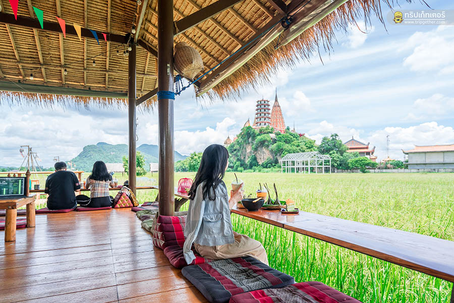 รักษ์คันนา คาเฟ่ คาเฟ่ที่สามารถชมความสวยงามของวัดถ้ำเสือได้อย่างเต็มตา เป็นการเรียกน้ำย่อยและนั่งพักจิบกาแฟก่อนเดินทางขึ้นไปชมความสวยงามของจริง ตัวร้านเป็นกระท่อมไม้ไผ่หลังคามุงด้วยใบจากแบบโอเพ่นแอร์ให้นั่งรับลมเย็นๆ ของธรรมชาติพร้อมดื่มด่ำความสวยงามของท้องทุ่ง โต๊ะเป็นบาร์นั่งห้อยขาใกล้ชิดกับท้องนา อีกทั้งยังมีโต๊ะบาร์ริมน้ำให้นั่งสัมผัสบรรยากาศสบายๆ อีกด้วย ไฮไลท์เด็ดของที่นี่คือ สะพานไม้ทอดยาวบนทุ่งนาสีเขียวขจีที่ออกไปเดินเล่นถ่ายรูปกับวิวนาและวัดถ้ำเสือได้สบายๆ ในส่วนของเมนูอาหารมีให้เลือกทั้ง ก๋วยเตี๋ยวต้มยำรสแซ่บอร่อยครบเครื่อง เค้ก เบเกอรี่ และเครื่องดื่มทั้งชา กาแฟ อิตาเลียนโซดาเติมความสดชื่นยามบ่ายได้เป็นอย่างดี